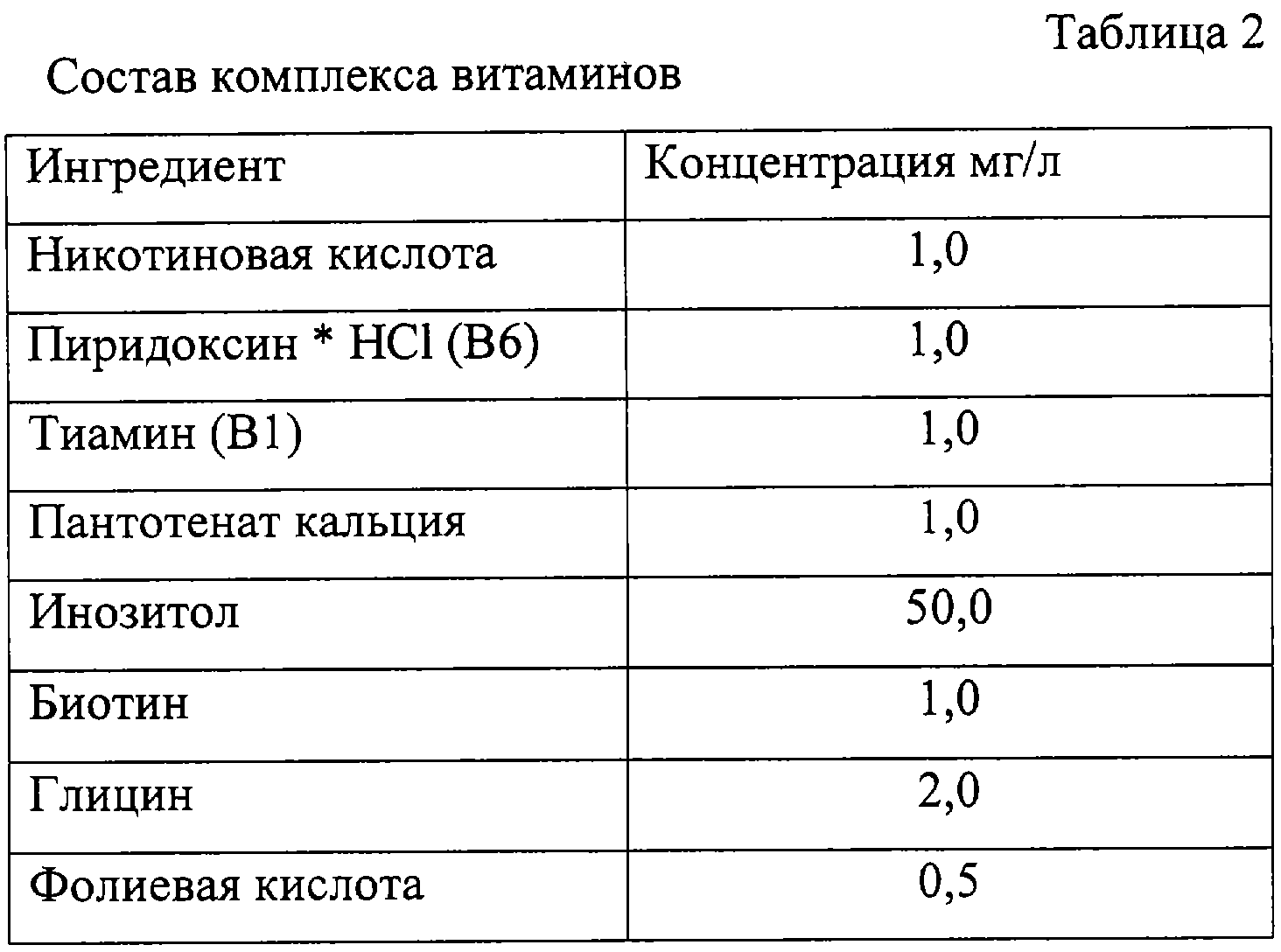 Для приготовления сред, представленных в табл.1, готовили раствор MS-солей в деионизованной воде, доводя рН до значения 5,6-5,8
