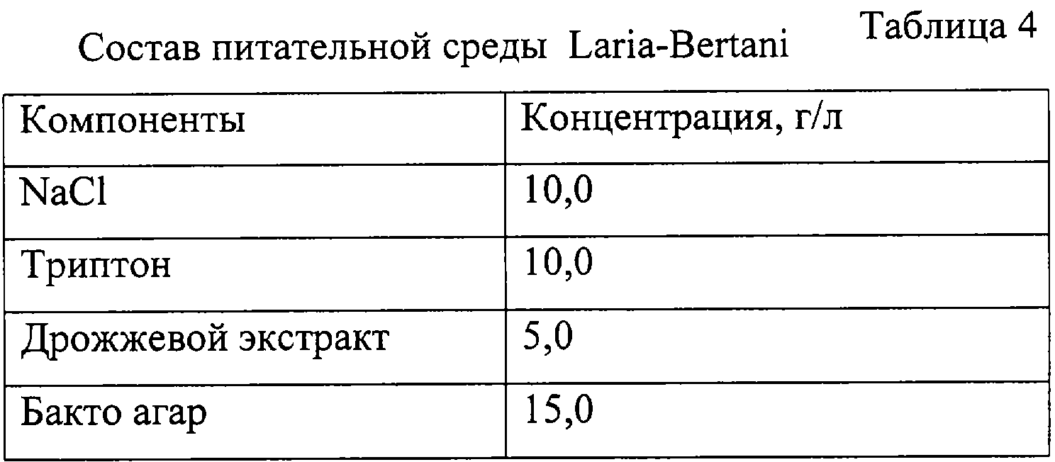 За день до сокультивации засевали вторую (II) ночную культуру объемом 6 1 мл. Для этого вносили в питательную среду LB (табл.4), содержащую селективные антибиотики рифампицин и канамицин в концентрации 25 и 50 мг/л соответственно, ночную культуру I в количестве 1/100 от конечного объема. Культивировали при +26 1 С, 100-140 10 об/мин.
