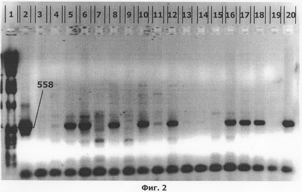 На фиг.2 приведен пример электрофоретического анализа продуктов ПЦР на препаратах ДНК модифицированных линий сорта Луговской (негатив). Дорожки: