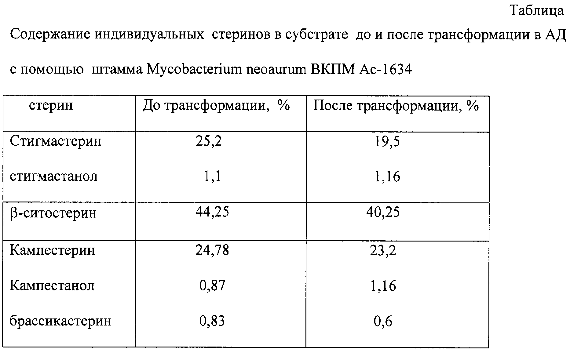 Штамм Mycobacterium neoaurum имеет низкую субстратную специфичность по отношению к стероидному субстрату, т.е. эффективно трансформирует смеси стеринов различного состава, такие как соевые стерины, фитостерины – отходы целлюлозной промышленности, в частности стерины таллового масла. Как видно из таблицы, соотношение идентифицированных индивидуальных стеринов в трансформируемом субстрате (фитостерин), анализируемых до и после ферментации, изменяется очень незначительно.