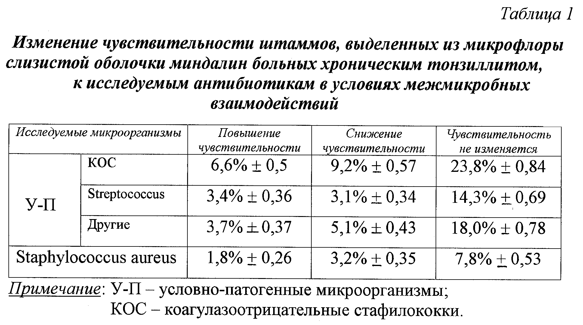 Авторами из клинического материала (слизистой оболочки миндалин больных хроническим тонзиллитом лиц) было выделено 95 штаммов микроорганизмов (86,3% составляли условно-патогенные микроорганизмы: коагулазоотрицательные стафилококки, стрептококки и другие микроорганизмы, 13,7% – S.aureus) и исследовано изменение чувствительности их к наиболее часто применяемым в практическом здравоохранении антибиотикам: пенициллинам (оксациллин, ампициллин), гликопептидам (ванкомицин), линкосамидам (клиндомицин), хлорамфениколу (левомицетин), макролидам (эритромицин), аминогликозидам (гентамицин) в условиях межмикробных взаимодействий.