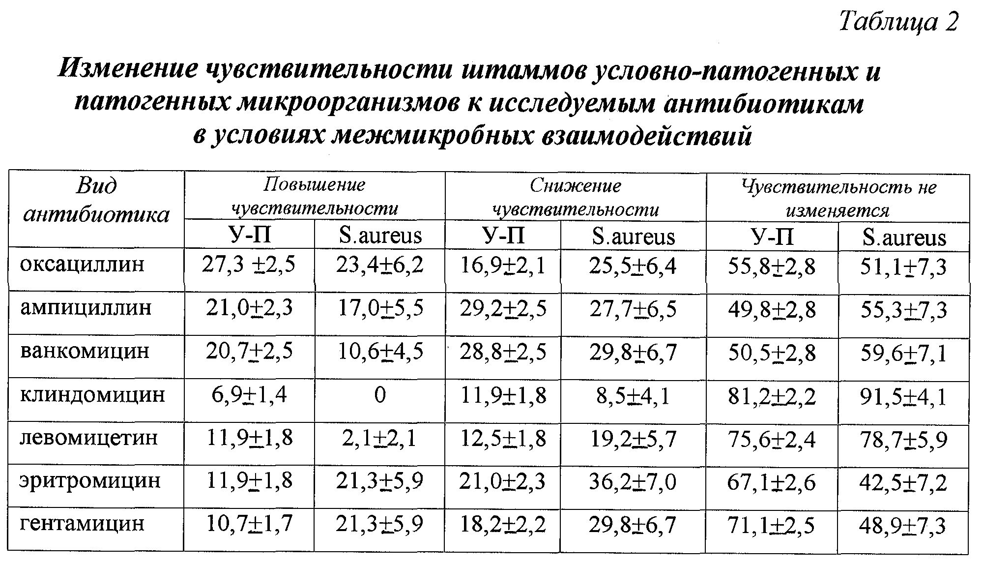 Из таблицы 2 видно, что у патогена S.aureus в условиях межмикробных взаимодействий чаще снижалась или сохранялась прежняя чувствительность к антибиотикам, чем у условно-патогенных микроорганизмов. Тогда как у последних в условиях межмикробных взаимодействий чаще повышалась чувствительность к антибиотикам. Поэтому так важно при лечении воспалительных заболеваний микробной этиологии определить эффективный антибиотик, который губительно действует на возбудителя, вызывающего воспаление, и не влияет на представителей условно-патогенных микроорганизмов данной экологической ниши.