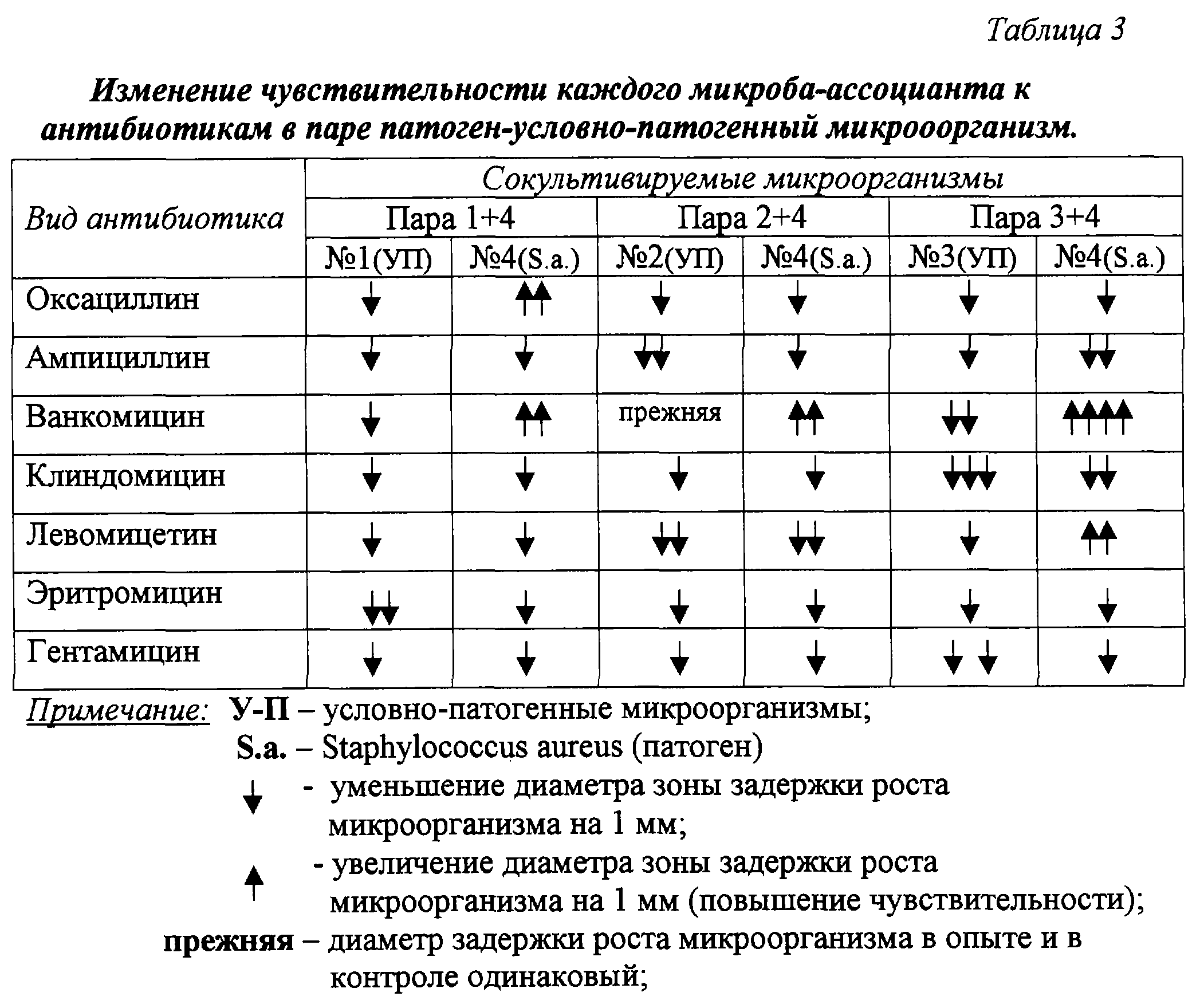 Пример 1. Ребенок Р., 14 лет. Диагноз: хронический тонзиллит в стадии субкомпенсации, обострение. Со слизистой миндалин выделены чистые культуры условно-патогенных микроорганизмов (штаммы №1 КОС (S.saprophyticus), №2 КОС (S.hominis), №3 Str.mitis) и патогена (№4 S.aureus). Были приготовлены одномиллиардные (1 млрд.) взвеси этих микроорганизмов. С помощью штампа в центре чашки Петри проводился перекрестный посев микробных взвесей возбудителя с каждым из выделенных представителей условно-патогенных микроорганизмов на 1,5% мясопептонный агар, контрольные посевы проводились по периферии чашки полосой. На центр контрольных посевов и на место перекреста в опыте накладывались диски, пропитанные антибиотиком (ТУ 9398-001-39484474-00 “Диски индикаторные картонные с противомикробными лекарственными средствами ДИ-ПЛС-50-01”, производитель ЗАО “Научно-исследовательский центр фармакотерапии” С.-Петербург). Исследовалось изменение чувствительности к наиболее часто применяемым в практическом здравоохранении антибиотикам: пенициллинам (оксациллин, ампициллин), гликопептидам (ванкомицин), линкосамидам (клиндомицин), хлорамфениколу (левомицетин), макролидам (эритромицин), аминогликозидам (гентамицин) в условиях межмикробных взаимодействий. Посевы инкубировались в термостате 24 часа при t=37 C. При оценке изменений чувствительности выделенных штаммов к антибиотикам в условиях симбиоза установлено следующее (таблица 3).