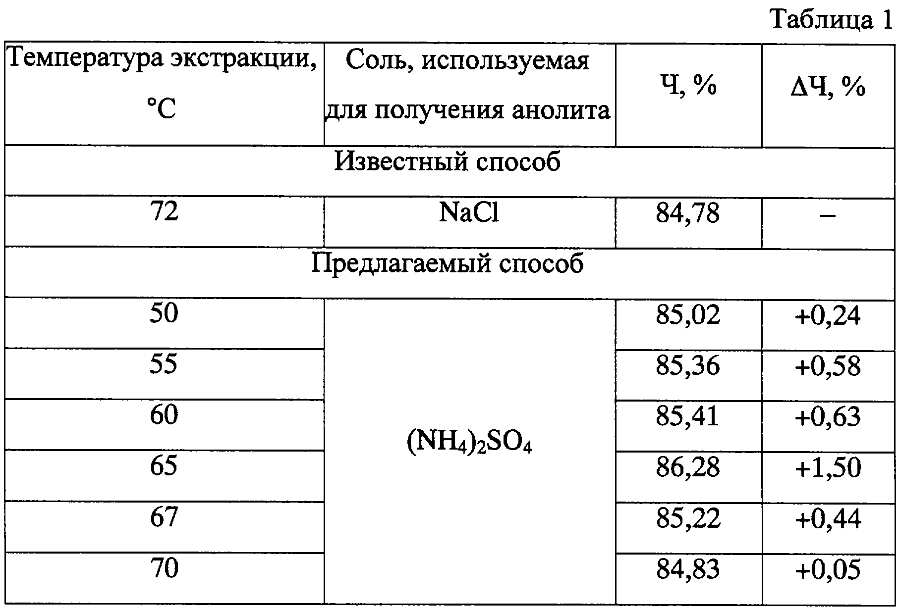 В табл. 1 представлена чистота диффузионного сока, полученного по известному и предлагаемому способам. При получении диффузионного сока по предлагаемому способу устанавливают различную температуру экстракции. Из данных, приведенных в табл. 1, следует, что при использовании для процесса экстракции анолита, приготовленного из раствора сульфата аммония обработкой в анодной камере диафрагменного электролизера, и при температуре процесса экстракции в интервале 55 – 67 С наблюдается наибольшее увеличение чистоты диффузионного сока (на 0,44-1,50%) относительно известного способа. Анолит, полученный из раствора хлорида натрия обработкой в анодной камере диафрагменного электролизера, как экстрагент имеет меньшую эффективность.