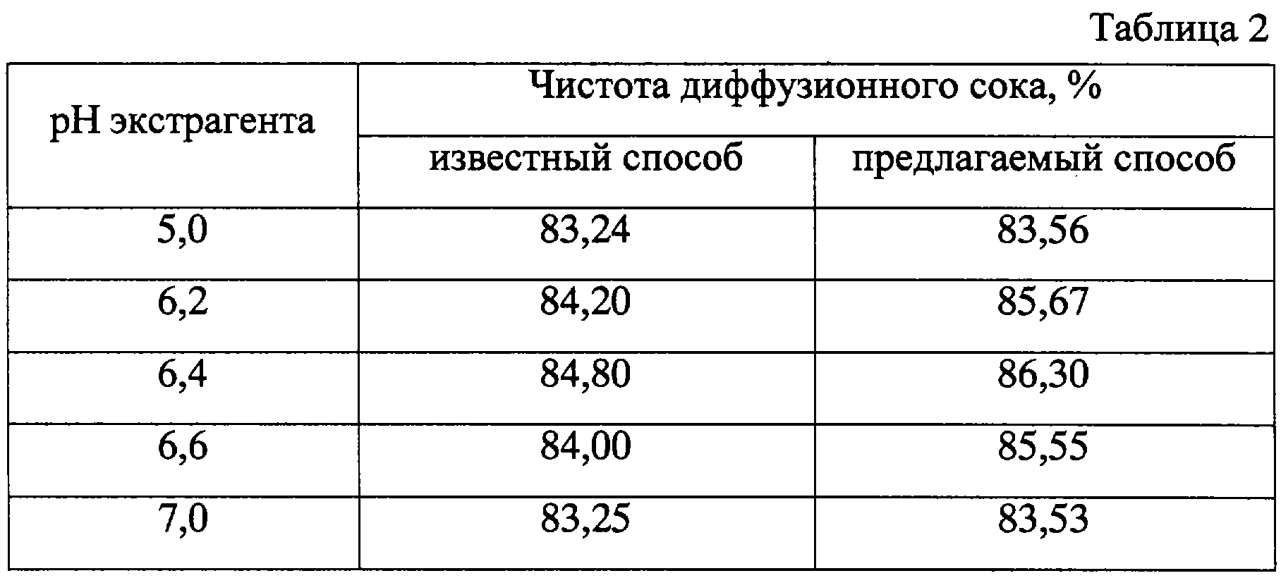 В табл. 2 приведена чистота диффузионного сока, полученного по известному и предлагаемому способам, в зависимости от рН экстрагента. Экстракцию по известному способу осуществляют при температуре 72 С с использованием анолита, полученного из раствора хлорида натрия обработкой в анодной камере диафрагменного электролизера, а по предлагаемому способу – при температуре 65 С с использованием анолита, полученного из раствора сульфата аммония обработкой в анодной камере диафрагменного электролизера. Из данных табл. 2 видно, что чистота диффузионного сока, полученного по известному способу, значительно меньше чистоты сока, полученного по предлагаемому способу, особенно в интервале рН 6,2-6,6. Диффузионный сок, полученный при использовании экстрагента с рН 5,0 и 7,0, имеет очень низкую чистоту, поэтому эти значения рН не следует использовать для процесса диффузии.