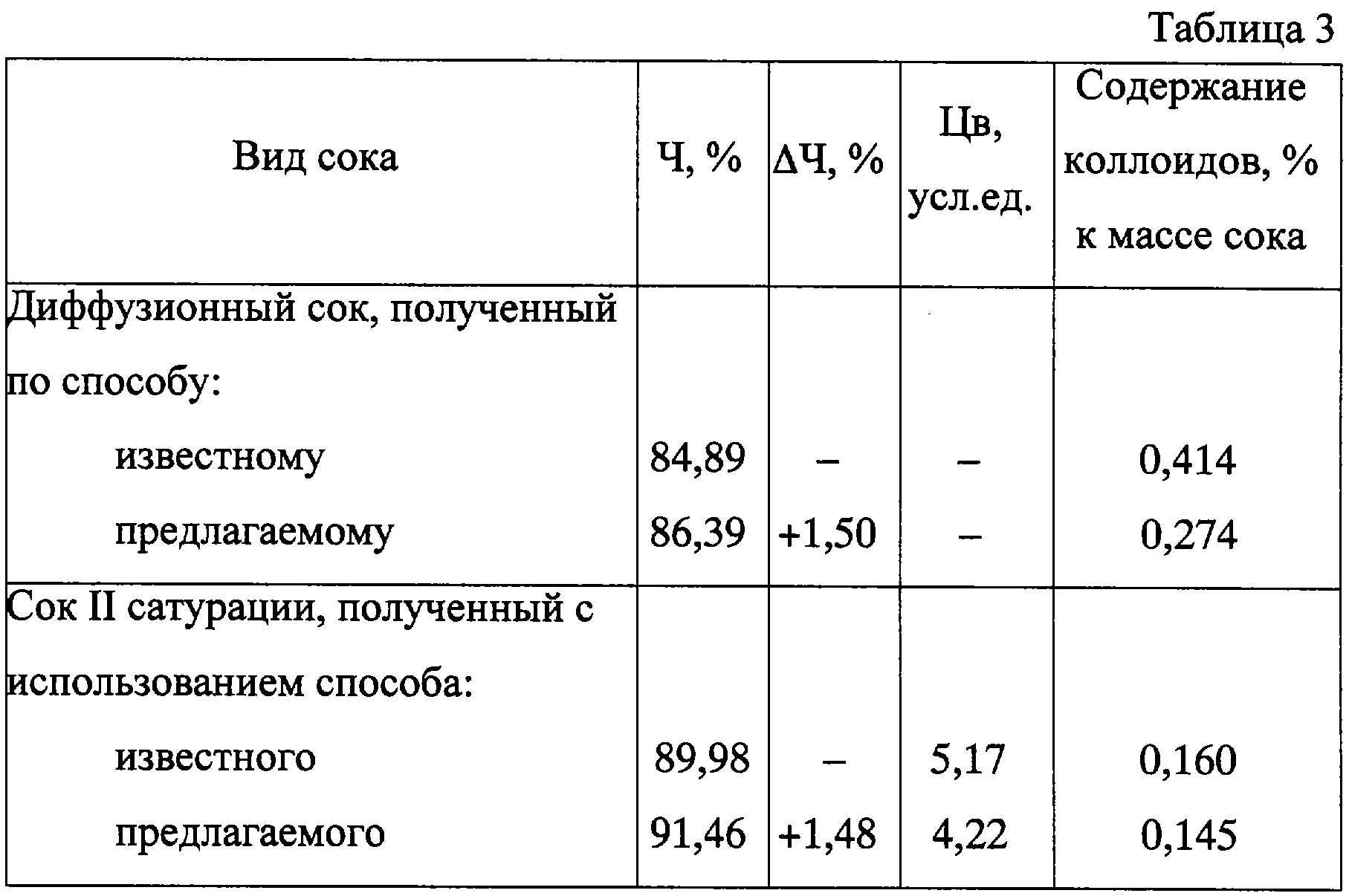 В табл. 3 приведены технологические показатели диффузионных соков, полученных по известному и предлагаемому способам, а также полученных из них соков II сатурации. Приведенные данные подтверждают, что сок II сатурации, полученный с применением предлагаемого способа, имеет более лучшие показатели в сравнении с соком II сатурации, полученным с применением известного способа: чистота сока больше на 1,48%, цветность меньше на 0,95 усл. ед., содержание коллоидов меньше на 0,015% к массе сока.