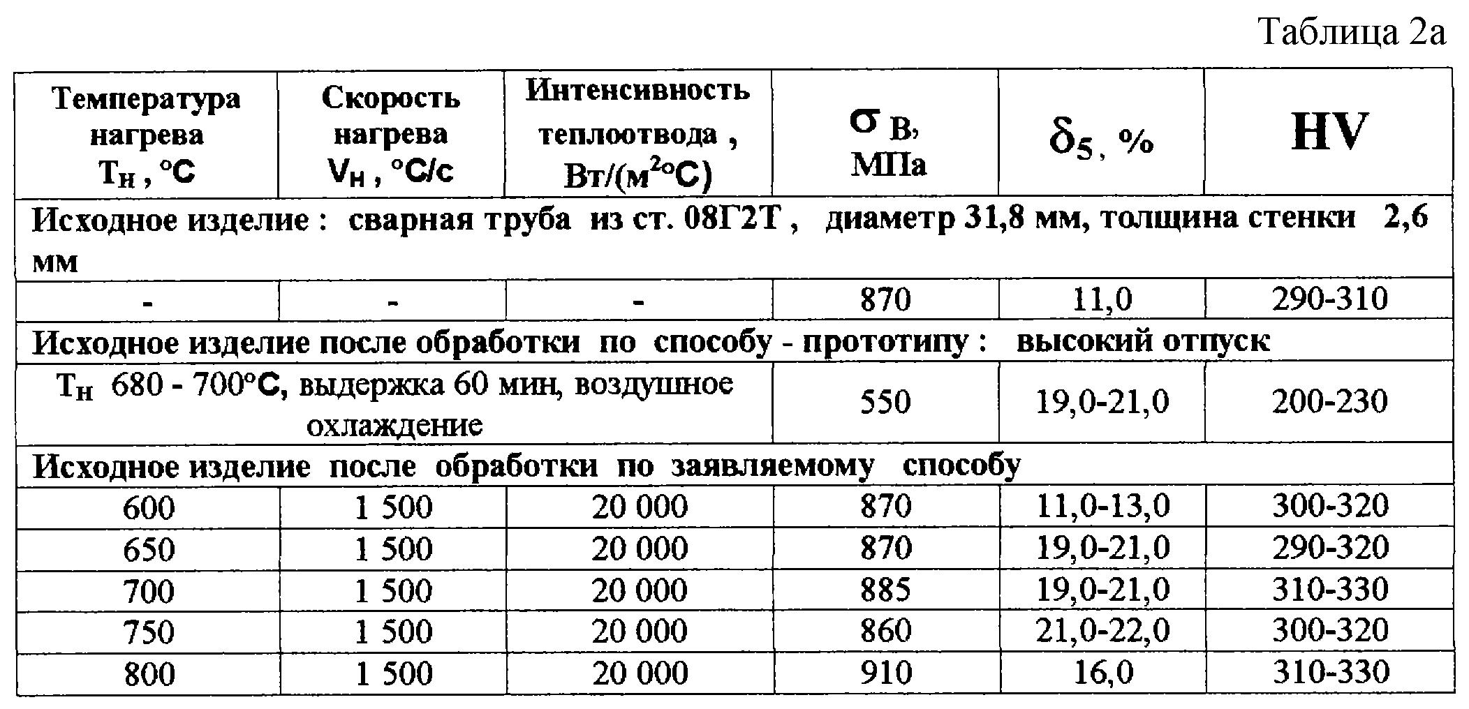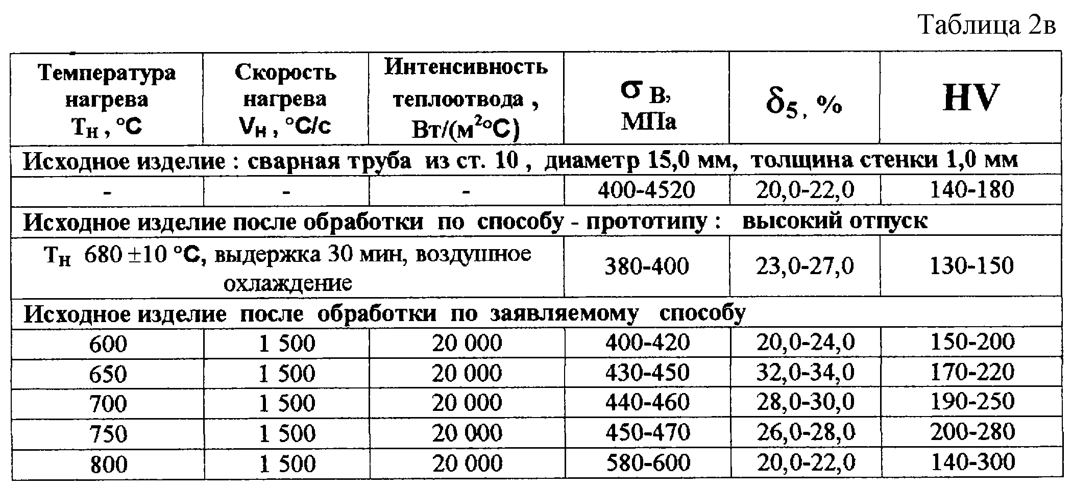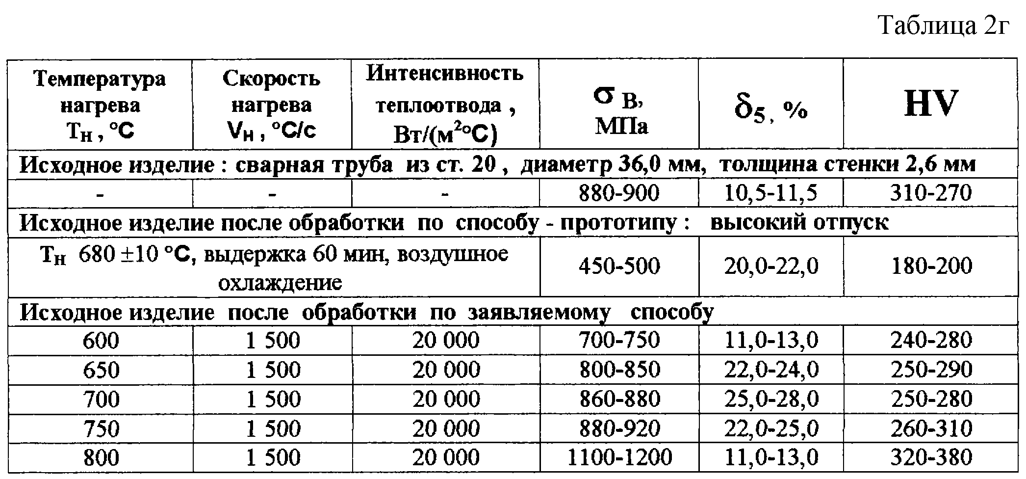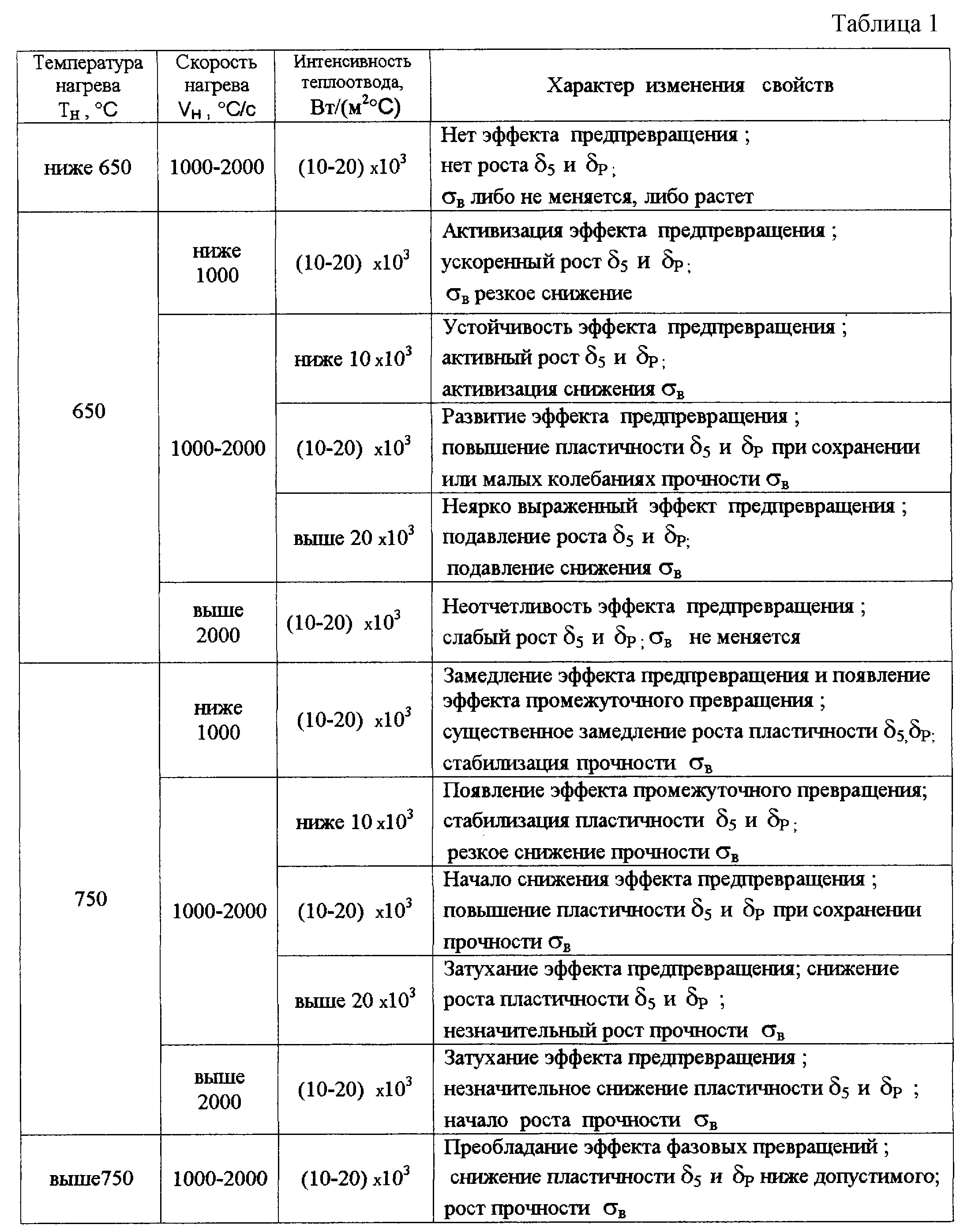 Из таблицы 1 виден характер изменения теплофизических эффектов и свойств изделий при различных режимах термической обработки. Данные таблиц 2 а-г подтверждают результаты таблицы 1 для конкретных марок сталей и конкретных режимов термической обработки в заявляемых пределах. Видно, что заявляемый способ обеспечивает устойчивое повышение относительного удлинения 5 изделий по сравнению с исходными их свойствами и устойчивое сохранение предела прочности на разрыв в на уровне исходного или незначительное его отклонение в ту или иную сторону от исходного в зависимости от марки стали. Эффект предпревращения устойчиво и активно проявляется в интервале температур 650-750 С; ниже 650 С он не выявляется, а выше 750 С перекрывается процессами фазовых превращений, то есть происходит смена механизмов протекания теплофизических процессов. Процессы предпревращения протекают особенно активно и четко при скоростях нагрева от 1000 до 2000 С/с. При скоростях ниже 1000 С/с устойчивость нарушается: 5 растет быстрее, чем в оптимальных режимах, а в начинает снижаться более активно.