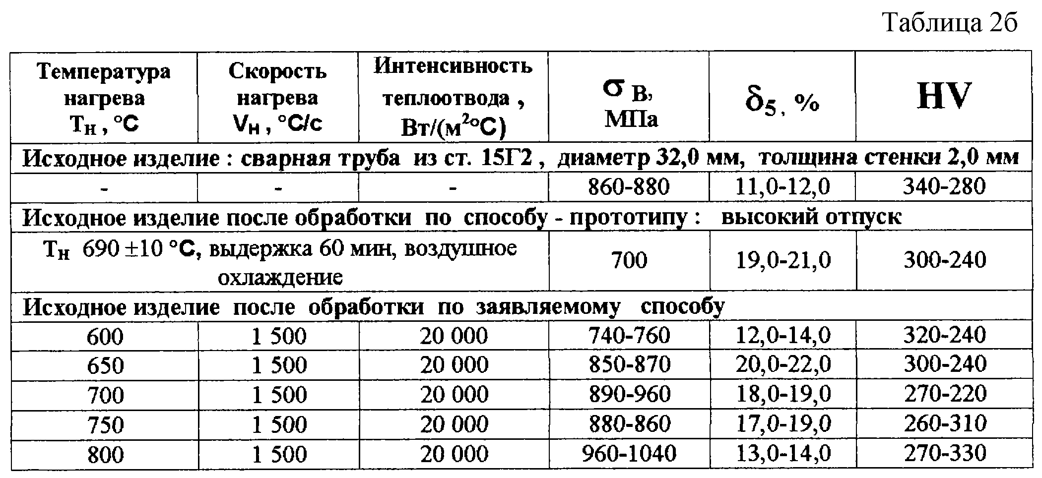 (57) Реферат: Изобретение относится к технологиям индукционной термической обработки изделий из низко- и среднеуглеродистых, нелегированных и малолегированных сталей. В частности, изобретение может быть использовано при индукционной термической обработке цилиндрических изделий, прутков, ленты, полос, сортового проката, труб различного сечения, в том числе сварных. Задача, решаемая предлагаемым изобретением, – получение изделий с оптимальным сочетанием прочностных и пластических свойств в промышленном производстве на широко распространенном промышленном оборудовании индукционного нагрева простым, экономичным и дешевым способом. Технический результат, обеспечивающий решение задачи, – получение определенной структуры изделий из низко- и среднеуглеродистых, нелегированных и малолегированных сталей, обуславливающей оптимальное сочетание высокой пластичности при прочности, близкой к исходной. Результат достигается тем, что в соответствии с предлагаемым способом термической обработки изделий из низко- и среднеуглеродистых, нелегированных и малолегированных сталей осуществляют нагрев изделия до температуры в интервале от (Ac1-75) С до (Ac1+25) С со скоростями от 1000 до 2000 С/с, затем производят охлаждение с интенсивностью теплоотвода (10-20)·103 Вт/м2· С. В результате такой термической обработки прочность изделия практически остается на уровне исходной ±10%, а пластичность значительно возрастает: относительное удлинение на пятикратных образцах 5 в 1,5-2 раза. 5 табл.