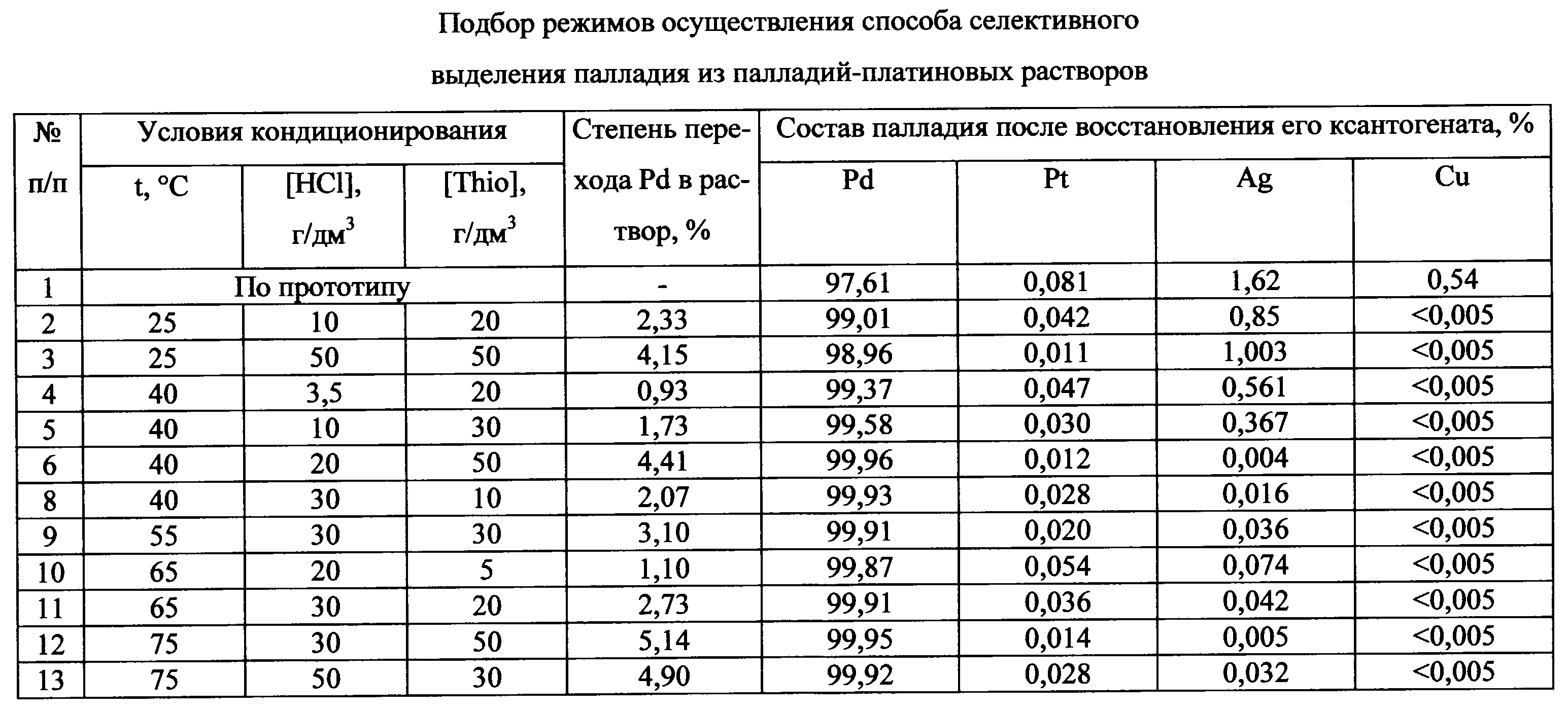 Режимы осуществления способа подобраны экспериментально. Кондиционирование свежеосажденных осадков ксантогената палладия тиокарбамидом (Thio) в растворе соляной кислоть (HCl) оуществляли в реакторе с перемешиванием при Т:Ж=1:5 и температуре 25-75 С в течение 4 часов. Полученный по окончанию операции осадок палладия отделяли фильтрацией, промывали водой, сушили, прокаливали при 800 С в течение 2 часов, полученную губку измельчали и анализировали на палладий, платину, серебро и медь.