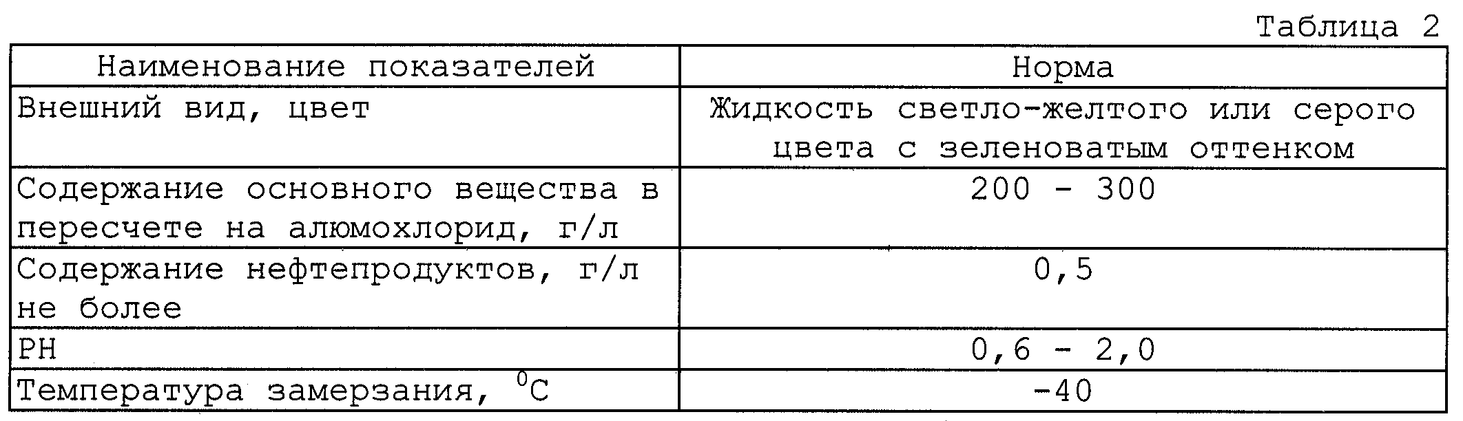 В качестве водного раствора алюмохлорида используют растворы отработанного хлористого алюминия по ТУ 38.102163-84 или гидроксохлористого алюминия по ТУ 38.302163-94, или алюмооксихлорид – отход производства изопропилбензола в соответствии с ТУ 38-102612-88, физико-химические свойства приведены в таблице 2.
