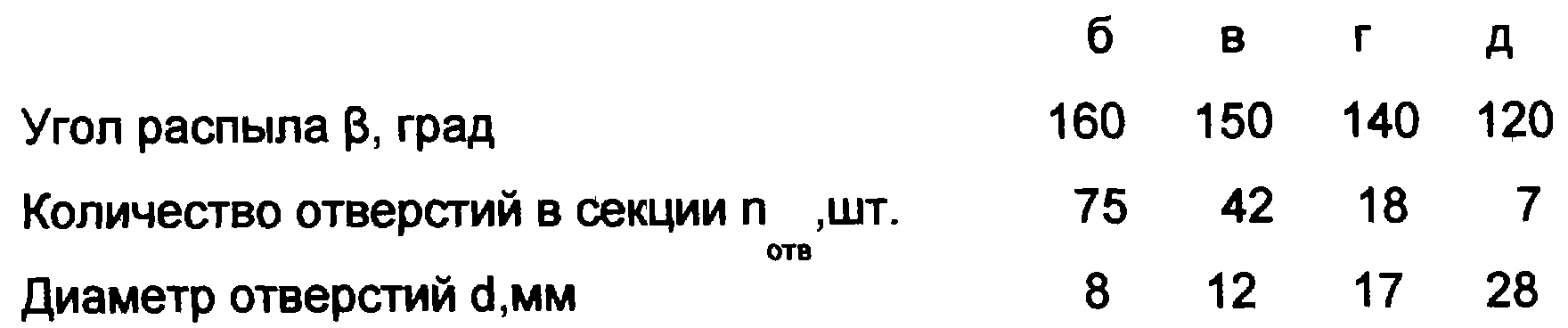Целесообразно наклонный экран 10 выполнять из набора секций: первая секция (в районе выгрузки продукта) выполняется без отверстий, а остальные с отверстиями в зависимости от длины туннеля. Секции выполняются из стальных нержавеющих листов толщиной =2 мм с разным количеством отверстий (nотв), отличающихся диаметром (d) и углом распыла ( ).
