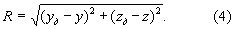 , как показано на фиг.7. Эвклидово расстояние между точками попадания (y,z) и датчика (y