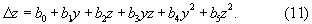 Акустическая мишень по существу является системой косвенных измерений, в которой по первичным измерениям, т.е. по временам встречи звуковой волны с акустическими датчиками решается обратная задача внешней баллистики, т.е. по модели (уравнениям) вычисляются координаты и скорость. Чтобы вычислить координаты с заданной точностью, необходимо задать или измерить координаты y i, z i положения акустических датчиков относительно системы координат мишени с меньшими погрешностями. Это практически невозможно, тем более, что моменты времени прохождения фронта звуковой волны через датчик фиксируются по моментам времени превышения сигналов уровня порога порогового устройства. Поэтому единственным средством представляется идентификация физической или регрессионной модели по результатам серии выстрелов, когда для каждого выстрела системой фиксируются времена ti и параллельно измеряются координаты пробоин в мишени на контрольной рамке 5 (фиг.1), которая устанавливается только для идентификации, а во время функционирования акустической мишени в режиме определения координат и скорости отсутствует (снимается). Так как параметров положения – координат датчиков много, то для идентификации физической модели (6) требуется большое количество выстрелов. При этом при каждом выстреле Vk, Up, , t0 также будут входить в число неизвестных. Поэтому используется следующий подход. В случае использования в модели (6) значений z i, z i, известных с точностью до погрешностей их непосредственного измерения, при вычислениях координат точки попадания y, z возникают погрешности, которые мало изменяются при измерении внешнебаллистических параметров пули или снаряда (углов наклона траектории, скорости), а также ветра. Поэтому используется регрессионная модель для поправок, например, в виде полного полинома степени 2