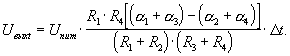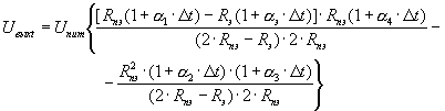 можно найти выходной сигнал мостовой цепи при воздействии температуры Uвыхt, заменив Rti=Ri (1+ i![]() t) и пренебрегая величинами второго порядка малости, можно записать:
