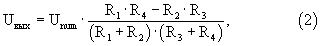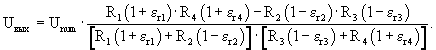 Для вывода аналитического выражения аддитивной температурной чувствительности необходимо найти аналитическое выражение для выходного сигнала мостовой цепи при воздействии номинального значения измеряемого параметра. Для этого воспользуемся выражением (1) и с учетом относительных изменений сопротивлений