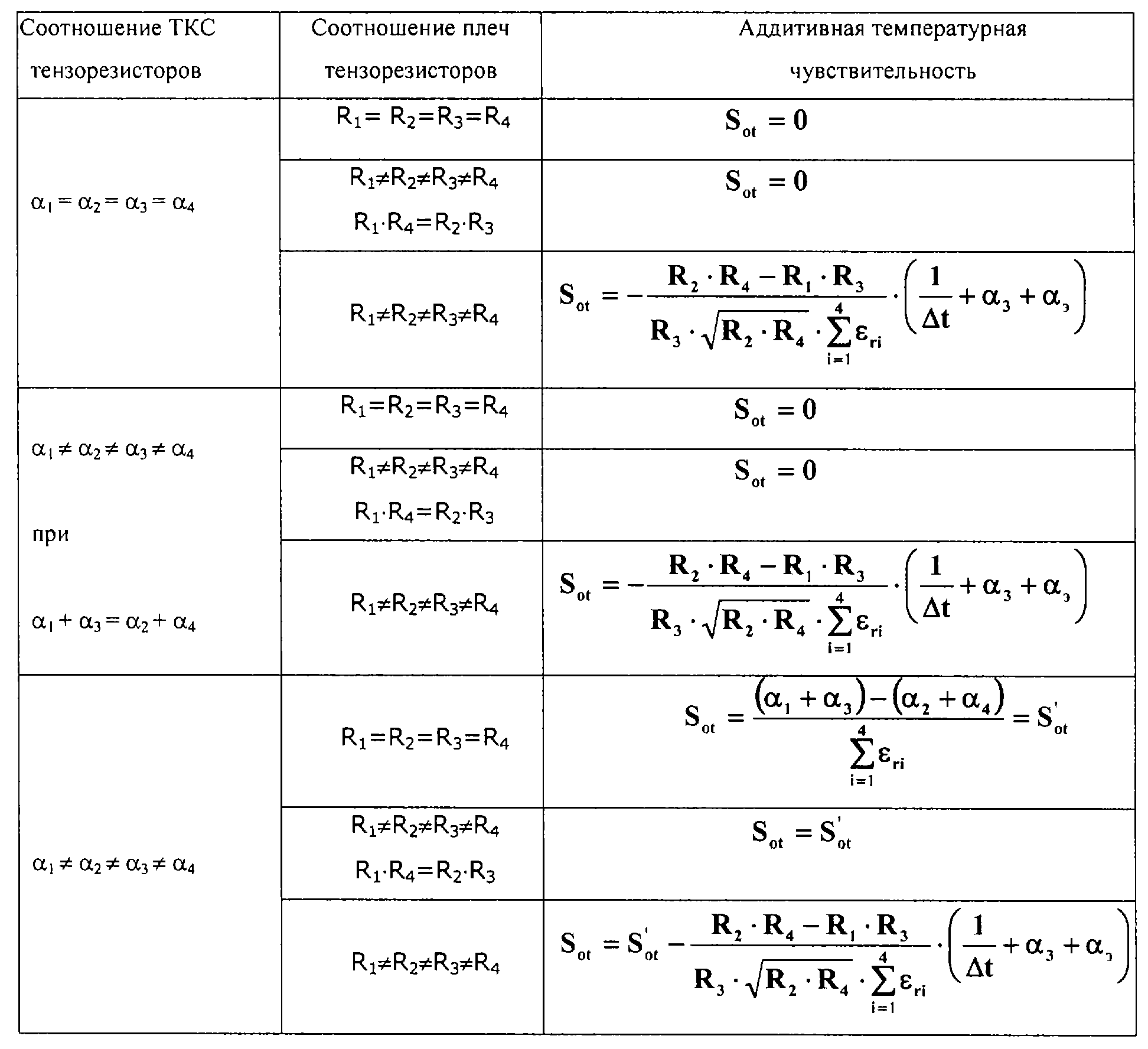 В таблице приведены все возможные случаи исполнения тензорезисторных датчиков с точки зрения технологических разбросов по номиналам и ТКС тензорезисторов и расчетные соотношения для определения аддитивной температурной чувствительности.