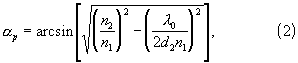 Пример. Для оптоэлектронного датчика давления с длинной волны оптического излучения о=0,63мкм, показателем преломления трапецеидальной призмы n1=1.51, зазором между мембраной и гранью призмы d2=10 мкм и воздушным заполнением зазора (n2=1) резонансный угол падения, определяемый выражением (2), составляет p=41,446 .
