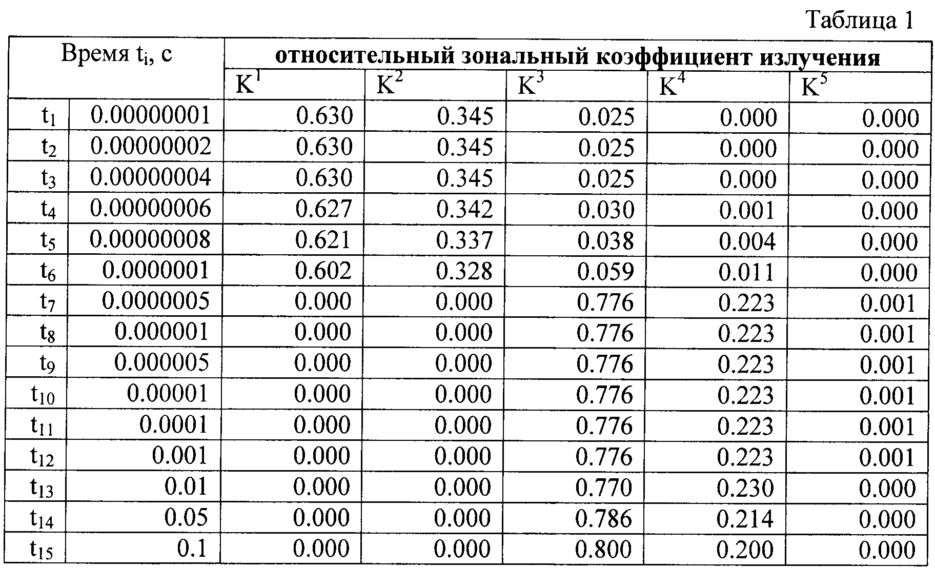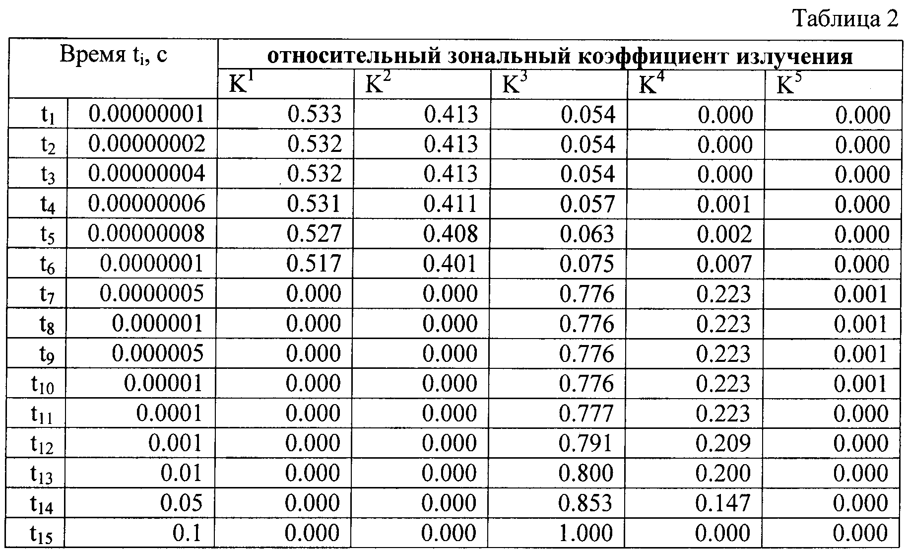 Одновременно регистрируют зональные потоки излучения образца во всех зонах в диапазоне от 10-8 до 1 с в виде зависимости силы тока фотоприемника от времени с временным разрешением 20 нc. Для регистрации используют ФЭУ-106 в диапазоне от 200 до 850 нм и ФЭУ-85 в диапазоне от 400 до 1000 нм. По формуле (5) в каждой зоне определяют относительные зональные коэффициенты излучения в моменты времени ti после окончания возбуждающего импульса. Временной диапазон, в котором определены относительные коэффициенты, выбран от 10-8 до 10-1 с, что определяется кинетическими параметрами наблюдаемого свечения. Результаты сводят в таблицы 1 и 2 для образцов кальцитов (а) и (б), представляющих собой паспорта соответствующих образцов.