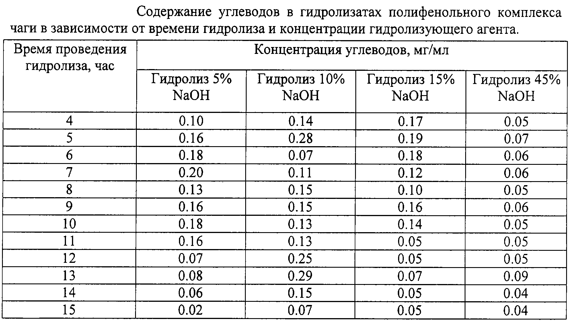 Формула изобретения Способ определения углеводного состава полифенольного комплекса чаги, включающий гидролиз полифенольного комплекса чаги химическим агентом при повышенной температуре, отличающийся тем, что в качестве химического агента используют 10%-ный водный раствор NaOH, гидролиз проводят при температуре (90 5) С в течение 15 ч, через четыре часа с начала гидролиза каждый час отбирают пробы гидролизата, определяют в них содержание выделившихся углеводов фенолсернокислотным методом, строят графическую зависимость концентрации углеводов от времени гидролиза и вычисляют количество углеводов, входящих в состав полифенольного комплекса, суммируя значения максимумов, найденных по графической зависимости.