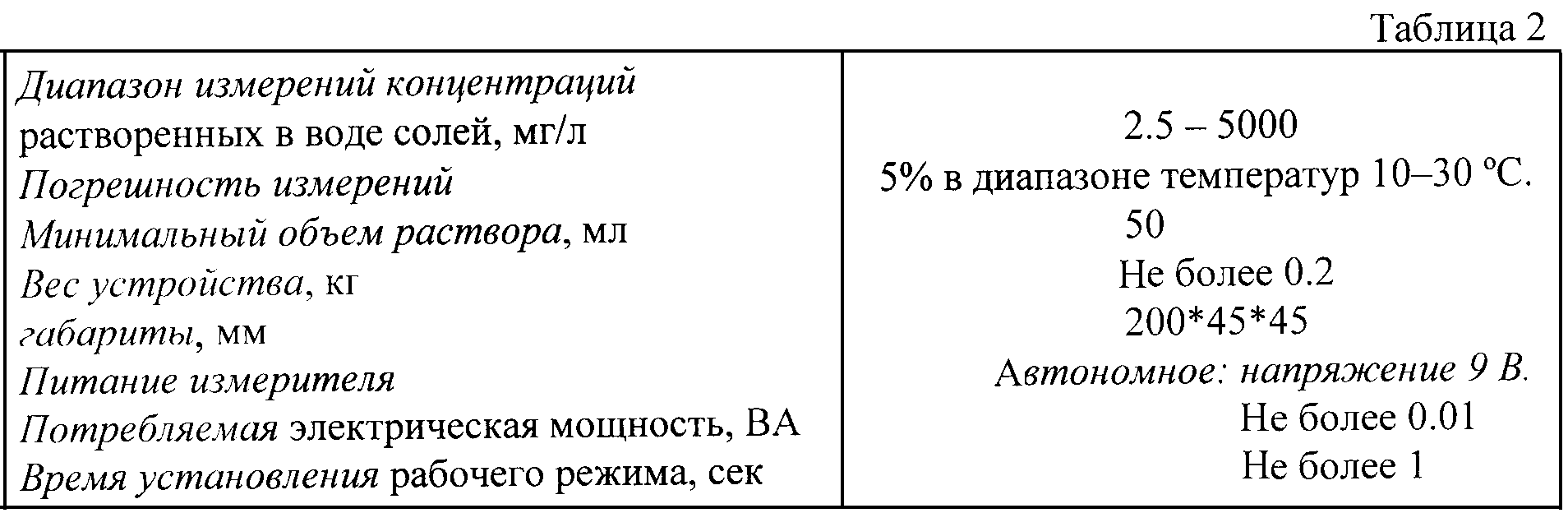 Основные технические характеристики измерителя качества воды приведены в таблице 2.