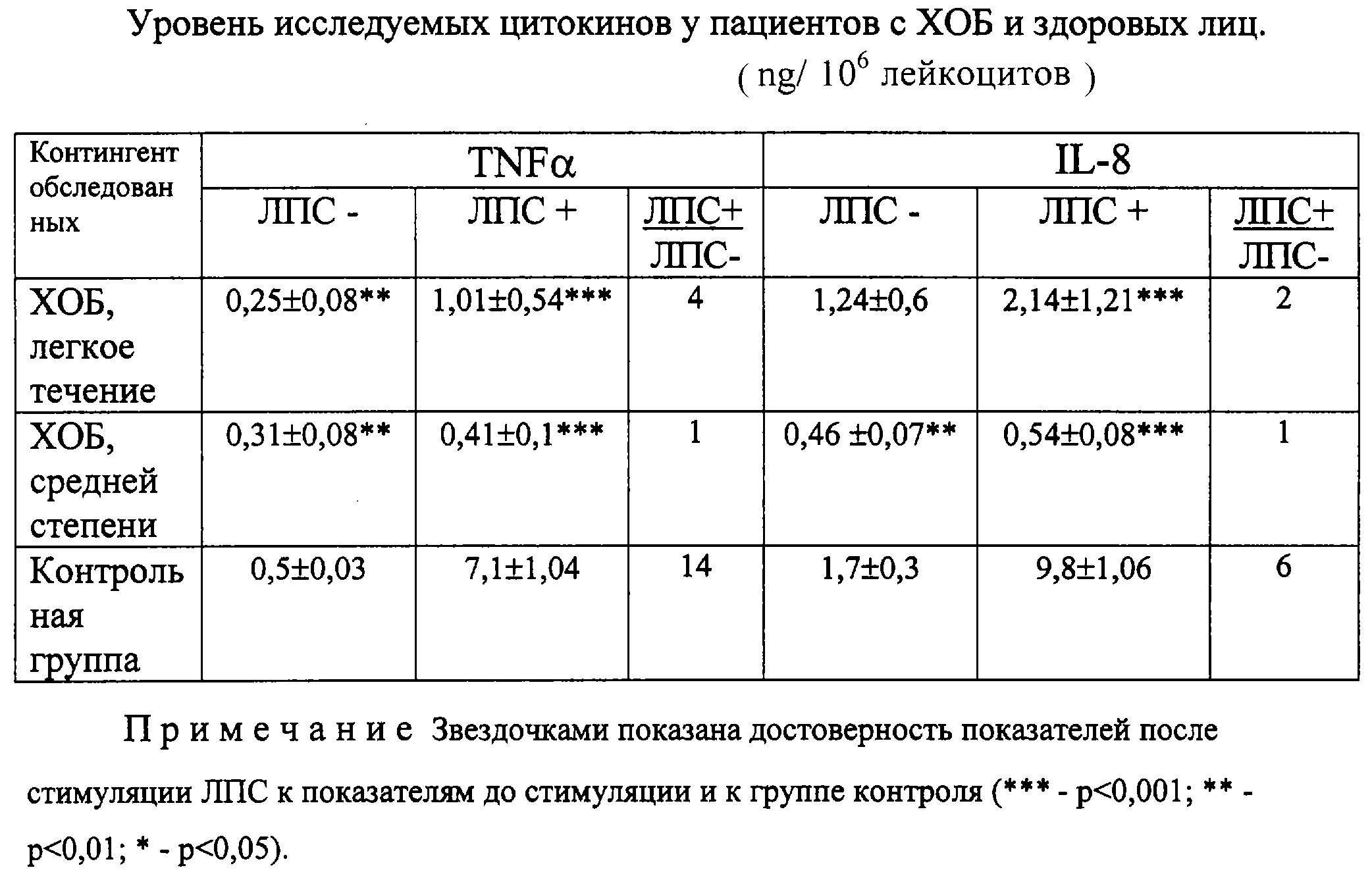 В результате анализа лабораторных показателей у обследованных с ХОБ выявлен сниженный спонтанный и индуцированный ЛПС синтез TNF- и IL-8 по сравнению с контрольной группой (таблица). Исследования по уровню цитокинов у практически здоровых лиц проводились ранее в ИМКВЛ, получено положительное решение на выдачу патента (по заявлению №2000115968/14(016607)). Продукция TNF- и IL-8 отличалась при спонтанном и индуцированном синтезе у больных с разной степенью тяжести ХОБ. У пациентов с легким течением заболевания базальный уровень IL-8 составил 1,24±0,6 ng/106 лейкоцитов, при стимуляции Е.соli его уровень возрастал в 2 раза. Спонтанная секреция TNF- составляла 0,25±0,08 ng/106 лейкоцитов, после индукции ЛПС его синтез повысился в 4 раза. У пациентов со средним течением хронического воспалительного процесса обращает на себя внимание резкое истощение показателей по сравнению с аналогичными уровнями у пациентов с легким течением ХОБ: базальный синтез TNF- и IL-8 составил 0,31±0,086 и 0,46±0,07 ng/106 лейкоцитов соответственно. При стимуляции ЛПС уровни TNF- и IL-8 не менялись. Имеется достоверное количественное различие показателей по сравнению с контрольной группой, где спонтанный синтез и стимулированный увеличивается в 6 и 14 раз соответственно (р<0,001).
