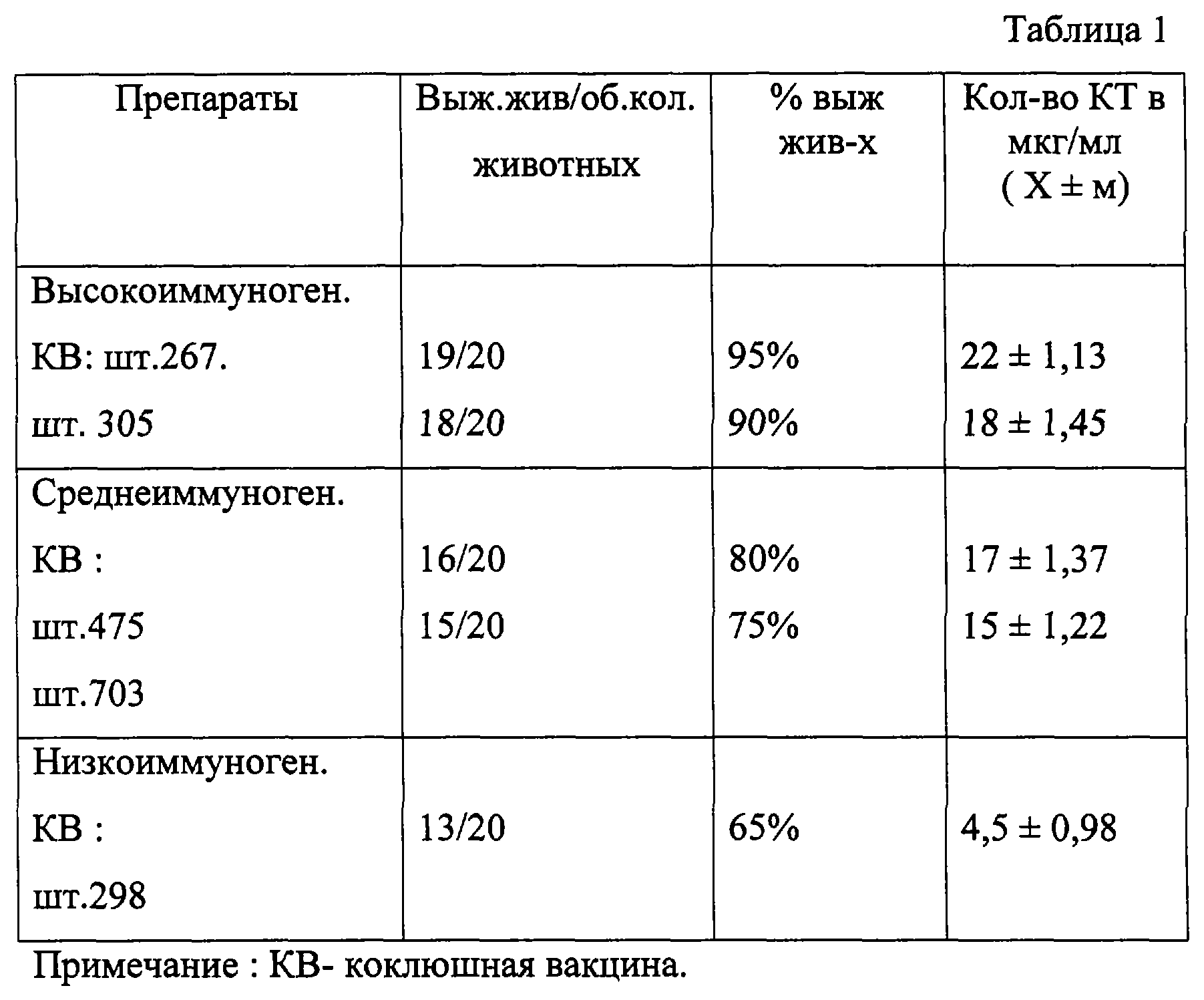 С целью отработки параметров предлагаемого способа были проведены соответствующие исследования. В этих опытах использовали коклюшные вакцины, приготовленные в соответствии с МРТУ 42-263-68, из производственных штаммов коклюшных бактерий, полученных из коллекции Государственного института стандартизации и контроля медицинских и биологических препаратов им. Л.А.Тарасевича (г. Москва). Высокоиммуногенные коклюшные вакцины были приготовлены из штаммов 267 и 305, со средней защитной активностью – из шт. 475 и 703, и слабоиммуногенная – из шт. 298. Иммуногенные свойства коклюшных вакцин изучали методом, описанным в прототипе (Инструкция по отбору, проверке и хранению производственных штаммов коклюшных бактерий, М. 1987, с.18-28) и предлагаемым способом.