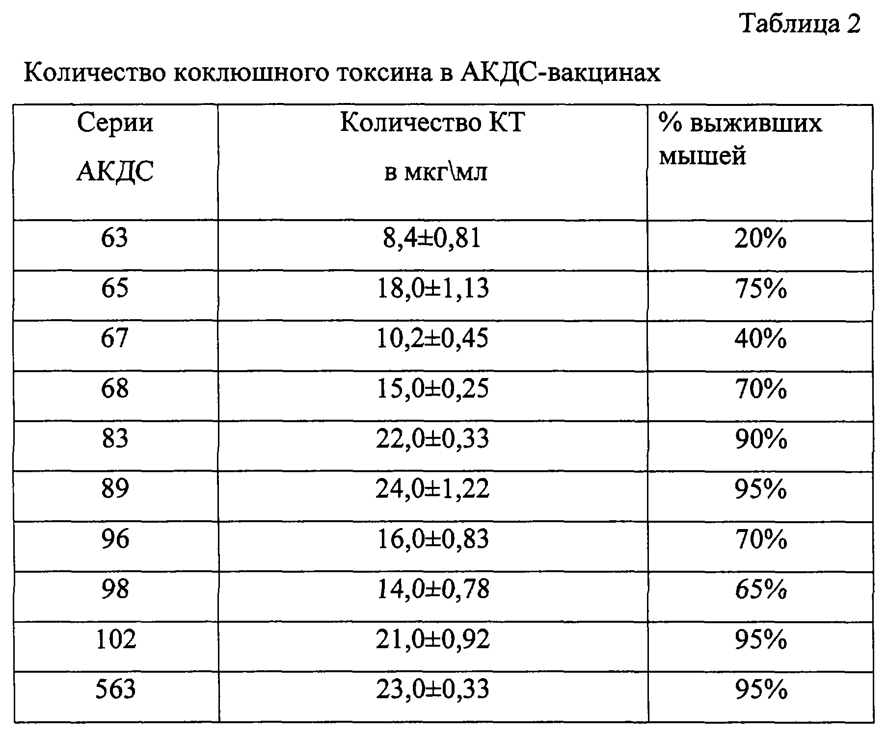Таким образом, на основании проведенных исследований можно утверждать, что предлагаемый способ адекватно позволяет оценивать защитную активность коммерческих коклюшных вакцин по количественному содержанию в них коклюшного токсина.