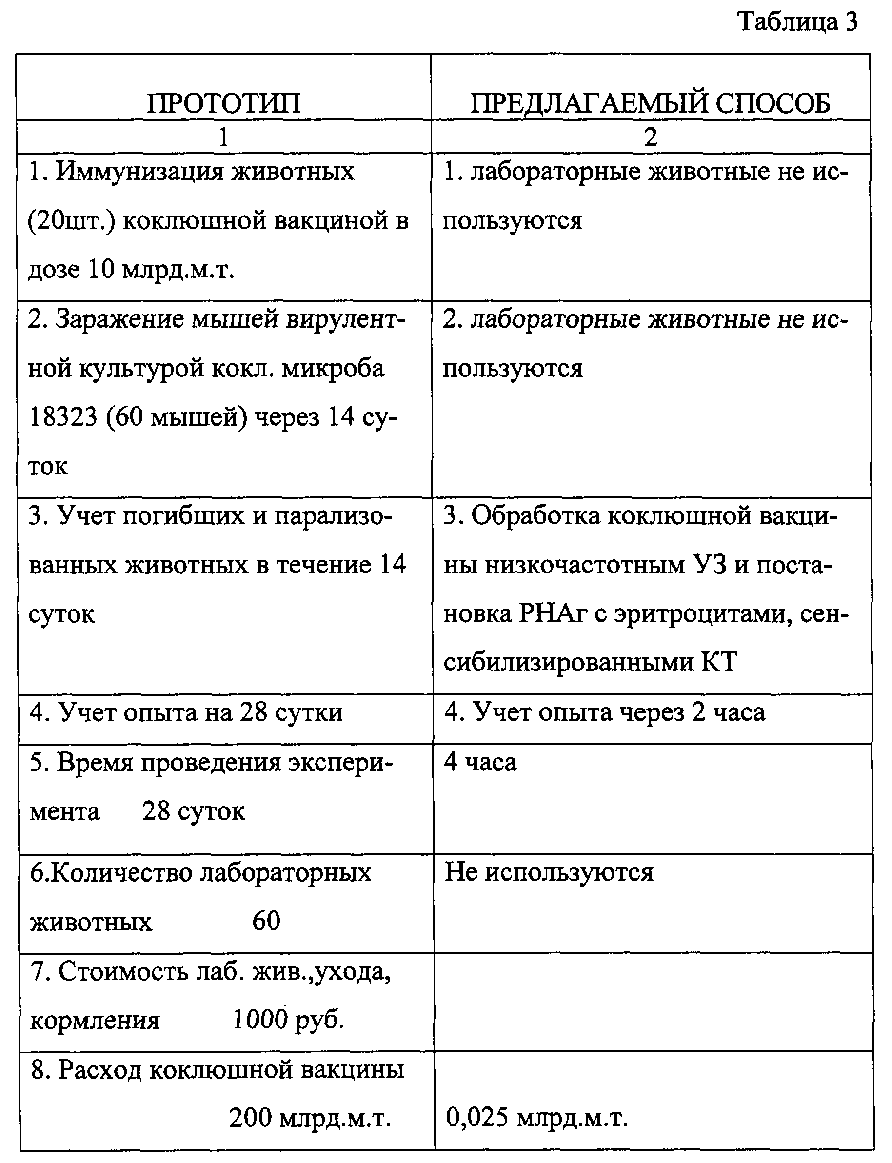 Таким образом, как видно из таблицы 3, предлагаемый способ по сравнению с прототипом обладает следующими преимуществами: на 27 суток сокращается срок исследования, в 1000 раз – стоимость эксперимента за счет исключения использования лабораторных животных, в 4000 – расход испытуемых коклюшных вакцин, а также существенно упрощается трудоемкость процесса.