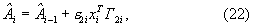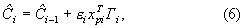 где С=[А, В] – блочная матрица параметров; i – квантор времени с шагом – невязка, называемая в дальнейшем ошибкой идентификации (не путать с ошибкой оценивания параметров системы); – расширенный вектор состояния ОУ; Гi – в общем случае переменная положительно определенная квадратная матрица размерностью (n+m) или скаляр.