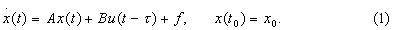 где x Rn – непосредственно измеряемый вектор состояния ОУ; и Rm – вектор управления (в дальнейшем – закон управления); – неизвестное время задержки управления, общее по всем скалярным управлениям, максимально возможное значение которого известно; f – вектор неконтролируемых внешних возмущений, ограниченный по норме; А, В – матрицы неизвестных параметров ОУ с соответствующими размерностями, в общем случае переменные по времени и по состоянию; – непосредственно измеряется или аналитически вычисляется по x(t).