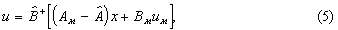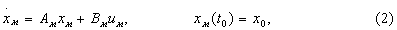 где хм – вектор состояния модели; uм – ограниченное по норме входное воздействие модели; размерности соответствуют уравнению (1); Ам и Вм – матрицы параметров модели в общем случае переменные по времени, причем оператор Ам – асимптотически устойчивый.