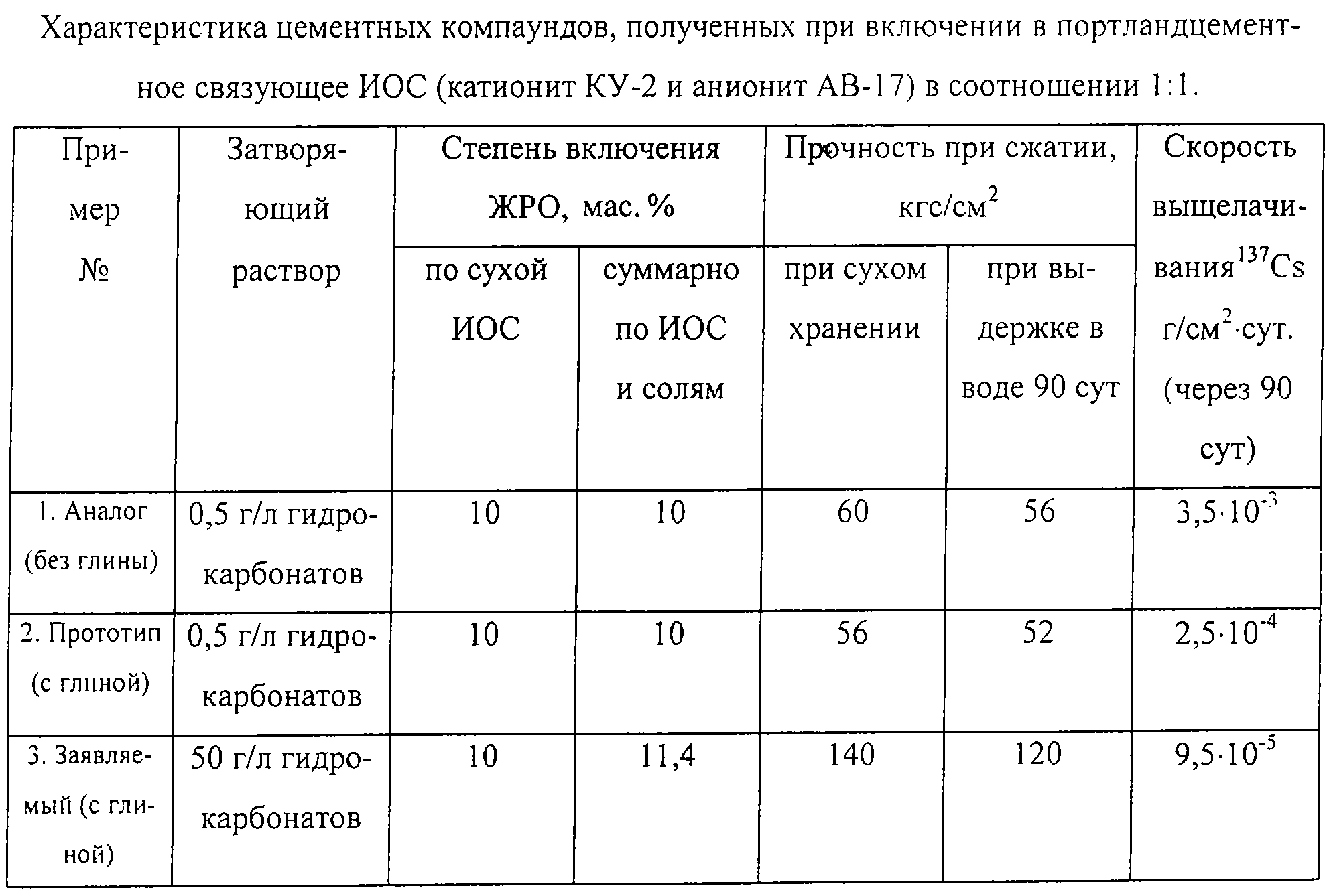 (57) Реферат: Изобретение относится к области переработки радиоактивных ионообменных смол. Сущность изобретения: способ включения радиоактивных ионообменных смол в портландцементное связующее заключается в их смешении с сорбционной добавкой глины, цементом и затворяющим раствором с последующим отверждением. В качестве затворяющего раствора используют радиоактивные концентраты солей природных гидрокарбонатных вод. Преимущества изобретения заключаются в увеличении степени включения радиоактивных отходов в портландцементное связующее и снижении выщелачиваемости радионуклидов из отвержденных продуктов. 1 табл. Изобретение относится к области переработки радиоактивных ионообменных смол (ИОС) методом цементирования. Отработанные катионообменные и анионообменные смолы являются наиболее радиоактивными (до 10-3 Ки/кг и более) отходами, образующимися при эксплуатации ядерных энергетических установок (ЯЭУ) [1]. Поэтому включение их в связующее, надежно изолирующее от окружающей среды, является важной экологической задачей. Известен способ включения радиоактивных ИОС в неорганическое связующее на основе портландцемента. В портландцемент рекомендуется включать не более 10% ИОС (по массе сухой смолы) при водоцементном отношении около 0,5 [2]. При этом для гидротранспорта и последующего отверждения ИОС цементированием используются малосолевые (менее 1 г/л) растворы “трапных” вод, представляющие собой используемые для водоснабжения природные воды, загрязненные протечками радионуклидов из контура ЯЭУ [1]. Недостатком данного способа является недопустимо высокая выщелачиваемость радиоцезия из портландцементных компаундов (более 10-3-10-4 г/см2·сут). Известен способ, включающий введение в портландцемент при отверждении ИОС добавки глинистых сорбентов (вермикулита, бентонитовой глины и др.), что обеспечивает снижение скорости выщелачивания радионуклидов до значений 10-4 г/см2·сут [3]. Данный способ по своей технической сущности и достигаемому эффекту наиболее близок к заявляемому и выбран в качестве прототипа. Недостатками данного способа являются низкая степень включения радиоактивных отходов в портландцементные компаунды, невысокая прочность отвержденных продуктов и недостаточно низкая выщелачиваемость радионуклидов. Согласно отечественным техническим требованиям РД 95 10497-93 механическая прочность радиоактивных цементных компаундов должна быть не менее 50 кгс/см2 (причем компаунды считаются водостойкими, если они сохраняют прочность не менее 50 кгс/см2 и после выдержки в воде в течение 90 сут), а выщелачиваемость радиоцезия – менее 10-3 г/см2·сут [4]. В то же время для исключения возможности разрушения радиоактивных цементных блоков при транспортировании в случае аварийной ситуации по данным МАГАТЭ необходимо, чтобы прочность цементного компаунда была не ниже 100 кгс/см2 [2]. Захоронение же радиоактивных цементных блоков в простейшие грунтовые могильники считается достаточно безопасным лишь при выщелачивании радионуклидов менее 1·10-4 г/см2·сут [5]. Задача, решаемая данным изобретением, заключается в увеличении степени включения радиоактивных отходов в портландцементное связующее и снижении выщелачиваемости радиоцезия из отвержденных продуктов при сохранении их высокой прочности. Сущность изобретения заключается в том, 