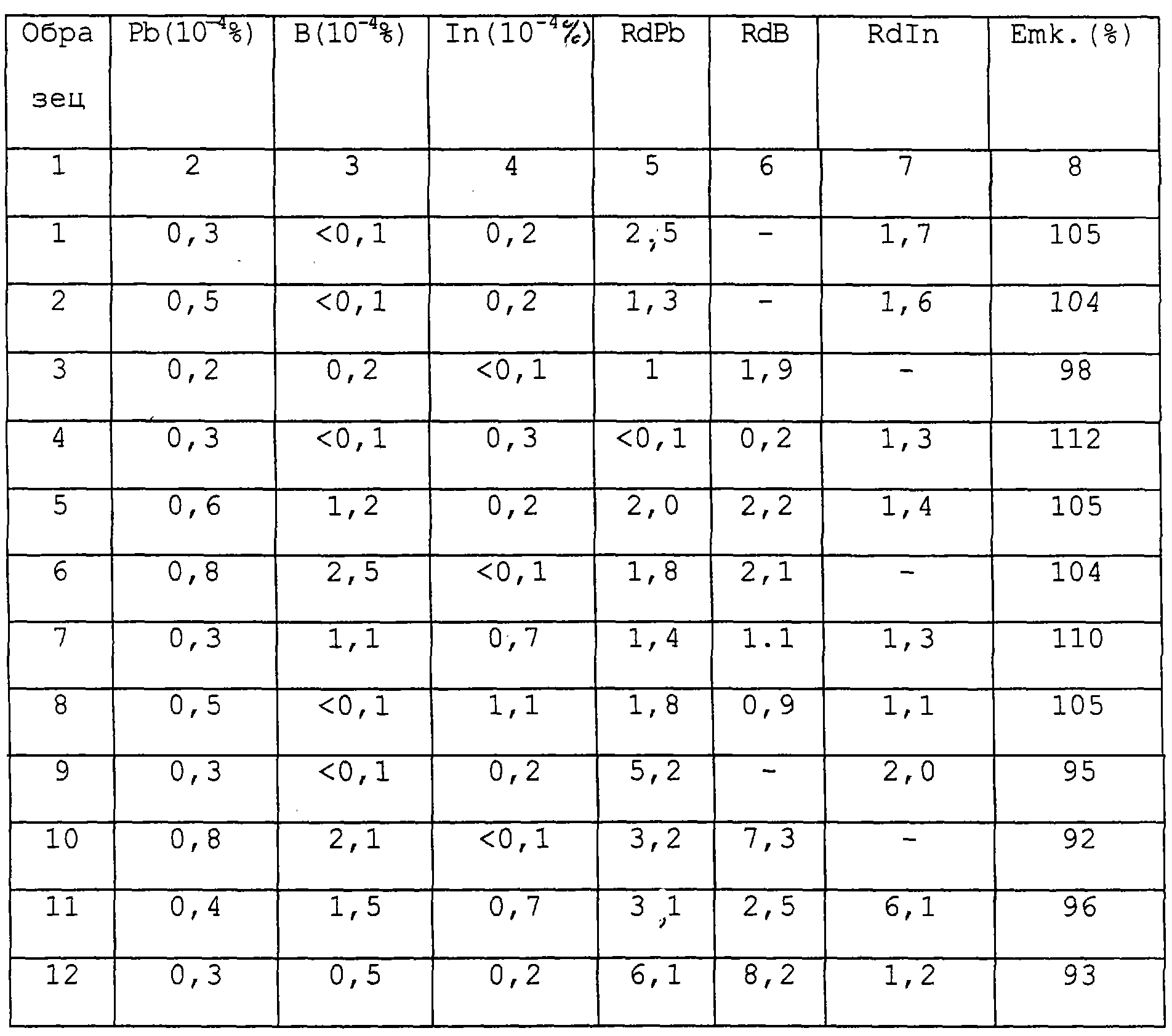 Затем измеряли емкость конденсаторов, полученных из образцов с питтинговой коррозией следующим образом: листы алюминиевой фольги подвергались электролизу в растворе, содержащем 5% НСl и 15% H2SO4 при плотности постоянного тока 200 мА/см2 в течение 60 с при 85°С. После чего листы погружали в раствор с 5% НС1 на 8 мин. Образование оксида осуществлялось при напряжении 450 В в растворе бората аммония. Емкость измерялась в мкФ/см2, но затем переводилась в проценты по отношению к эталонной рафинированной фольге. Полученные результаты сведены в таблицу.