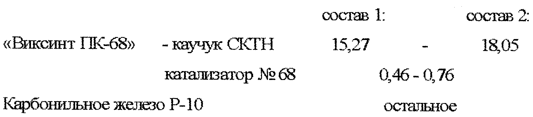 Для достижения поставленной цели в составе на основе магнитодиэлектрика, состоящего из карбонильного железа и полимерного связующего, в качестве полимерного связующего использован компаунд “Виксинт ПК-68”- низкомолекулярный каучук (ТУ 38.103508-81) и катализатор №68 при следующем соотношении компонентов, вес.%:
