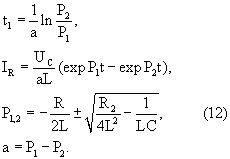 Сравним мощность, выделяемую на нагрузку для двух случаев: устройство-прототип и предлагаемое устройство. Для расчетов выберем величину сопротивления нагрузки в эквивалентной схеме, обеспечивающей апериодический разряд формирующей линии. В этом случае могут быть использованы аналитические формулы, приведенные в [Каплянский А.Е., Лысенко А.П., Полотовский А.С. Теоретические основы электротехники. М.: Государственное энергетическое изд-во, 1961, 527с.]. На стр. 340-341 приведены соотношения для расчета момента времени 1 при разряде емкости на последовательно включенные омическое сопротивление и индуктивность, когда ток в омической нагрузке максимален и величины тока через омическую нагрузку IR: