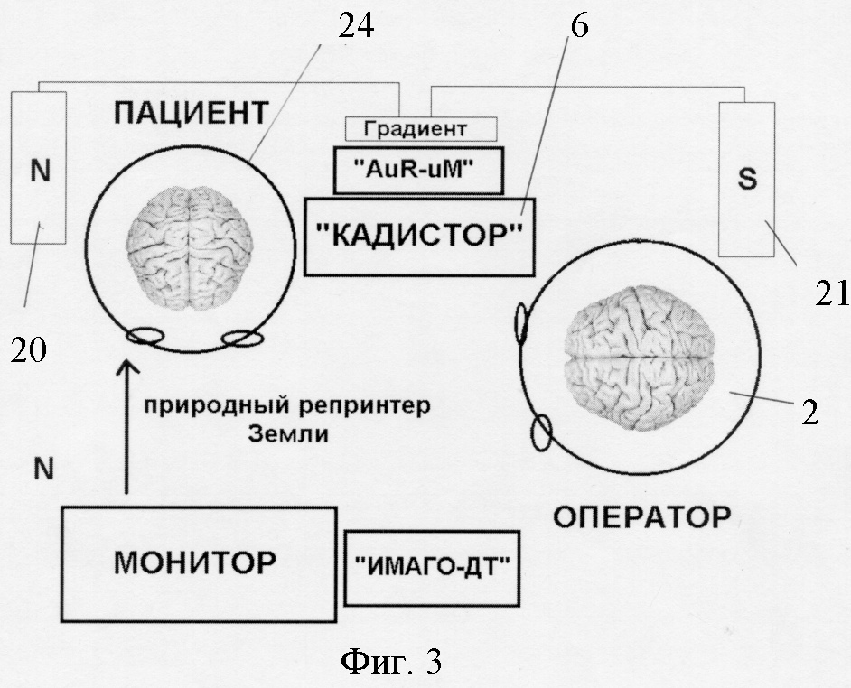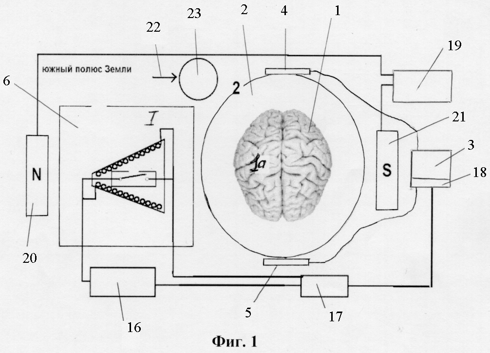 (57) Реферат: Изобретение относится к области медицины и может быть использовано для увеличения достоверности результатов проводимых операторами биолокационных исследований за счет усиления их интуиции. Устройство содержит блок определения активного полушария головного мозга оператора и индивидуальной частоты его тета-ритма, блок питания, геркон с вакуумным корпусом, конусообразную спиральную катушку управления и блок синхронизации. Блок определения активного полушария головного мозга оператора и его тета-ритма представляет собой энцефалограф с электродами. Блок синхронизации выполнен в виде амплитудного детектора. Устройство позволяет получить достоверные и стабильные результаты работы операторов биолокации за счет потенцирования процессиональных способностей операторов биолокации, повышения их интуиции и способности строить долговременные прогнозы. 3 з.п. ф-лы, 4 ил. Область техники, к которой относится изобретение Изобретение относится к области медицины, а именно физиологии труда, и может быть использовано операторами биолокации для повышения достоверности результатов проводимых ими биолокационных исследований при поиске, например, полезных ископаемых или при нетрадиционной медицинской диагностике. Уровень техники Известен способ повышения стабильности и увеличения степени достоверности результатов работы операторов биолокации (патент РФ № 2142826, А 61 N 2/00, опубл. 20.12.99. Бюл. № 35) путем дистанционного, бесконтактного воздействия на мозг операторов биолокации импульсным низкочастотным однополярным магнитным полем с регулируемыми значениями полярности, несущей частоты, магнитной индукции, частоты прерывания и скважности, с заполнением импульса током несущей частоты. Причем выбор полярности магнитного поля для правого и левого полушария, а также параметров формируемых однополярных магнитных импульсов осуществляет сам оператор биолокации, применяя биолокационную рамку или другие аксессуары. Авторы считают, что применение этого способа способствует получению более достоверных и стабильных результатов за счет потенцирования профессиональных способностей операторов биолокации, повышения их интуиции и способности строить более достоверные долговременные прогнозы. Однако для осуществления указанного способа желательно привлечение специально обученных операторов биолокации, умеющих работать с биолокационными аксессуарами (маятники, Г-образные рамки и др.). Наиболее близким по своей сути к заявляемому решению является способ увеличения достоверности биолокационных исследований (патент РФ № 2119806, А 61 N 2/04), выбранный в качестве прототипа, при котором на оба полушария головного мозга оператора биолокации воздействуют импульсным низкочастотным однополярным магнитным полем с регулируемыми параметрами, при условии выбора характеристик воздействующего поля самим оператором биолокации, с одновременным введением между индуктором магнитного поля и височной областью работающего оператора биологического усилителя его профессиональных способностей в виде биологического объекта (организма, системы организмов) или его составных частей (органов, тканей, клеточных элементов, в том числе крови или спермы) в стадии необратимых разрушений (гибели). По мнению авторов биологический объект или его ча