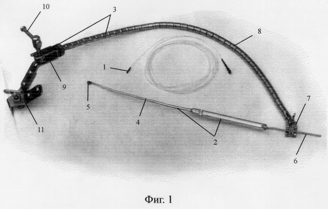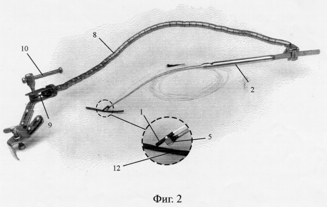 Формула изобретения Способ контактной микрососудистой допплерографии путем размещения допплерографического датчика под острым углом к исследуемому сосуду для получения оптимального допплерографического сигнала на период проведения регистрации линейной скорости кровотока, отличающийся тем, что допплерографический датчик монтируют посредством зажима-клипсы на съемном направляющем устройстве, включающем гибкий металлический стержень и нейрохирургический шпатель, соединяющий направляющее устройство с нейрохирургическим автоматическим ретрактором, моделируют изгиб металлического стержня направляющего устройства и затем фиксируют его в избранном положении посредством перевода бранши нейрохирургического автоматического ретрактора из свободного в фиксированное состояние. РИСУНКИ
