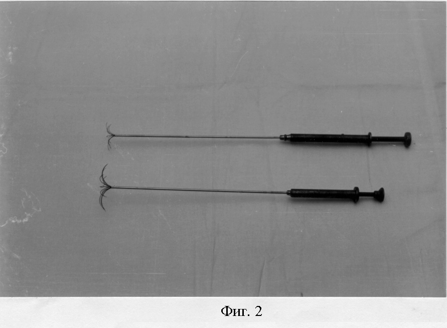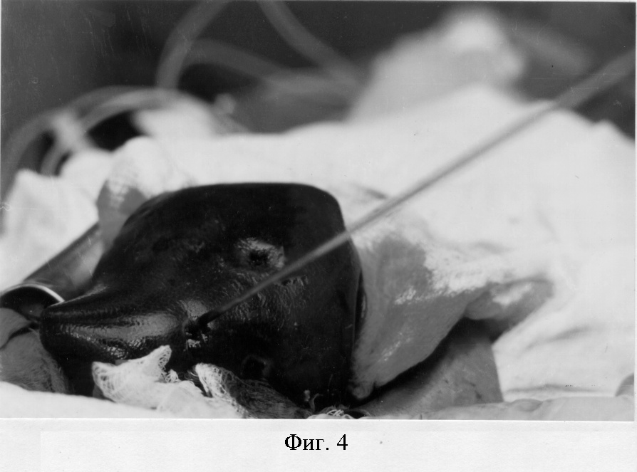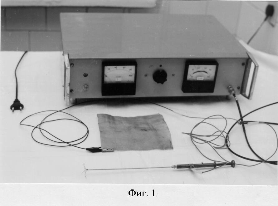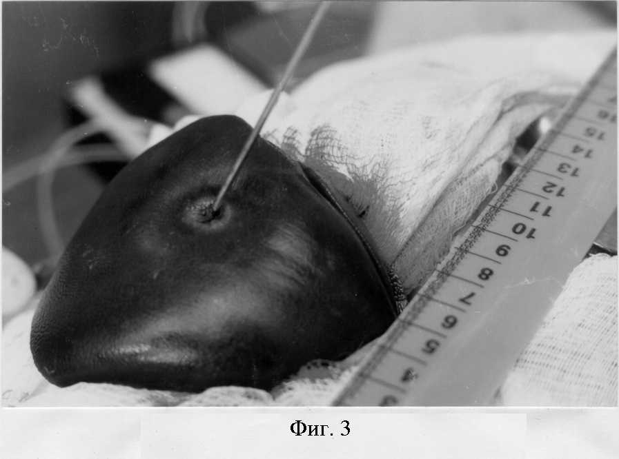 Поросенку (в возрасте 3 месяца, весом 35 кг) под внутривенным обезболиванием выполнялась верхнесрединная лапаротомия. После включения аппарата высокочастотной деструкции (фиг.1) в печень вводят зонтичный электрод диаметром 3 см (фиг.2, 3). Продолжительность высокочастотного воздействия составила 2-3 минуты при напряжении 100 В, последовательно в 4-х разных точках на расстоянии 8-10 см (фиг.4). Игольчатым электротермометром на расстоянии 1-3-5-8 см от точки введения (фиг.5) зонтичного электрода определялась внутритканевая температура печени на глубине 3-4 см.