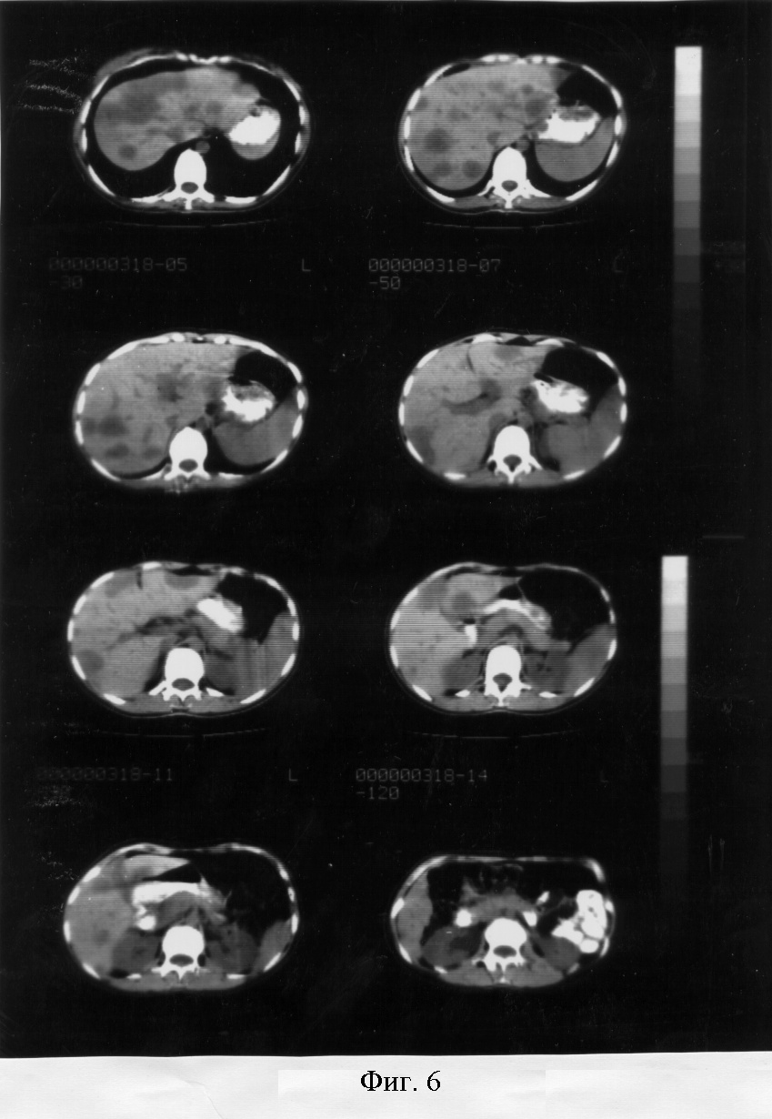 Данные УЗИ от 11.07.02 г.: в I, IV, VI сегментах печени лоцируется гиперэхогенное образование с центральными зонами фиброза (фиг.7).