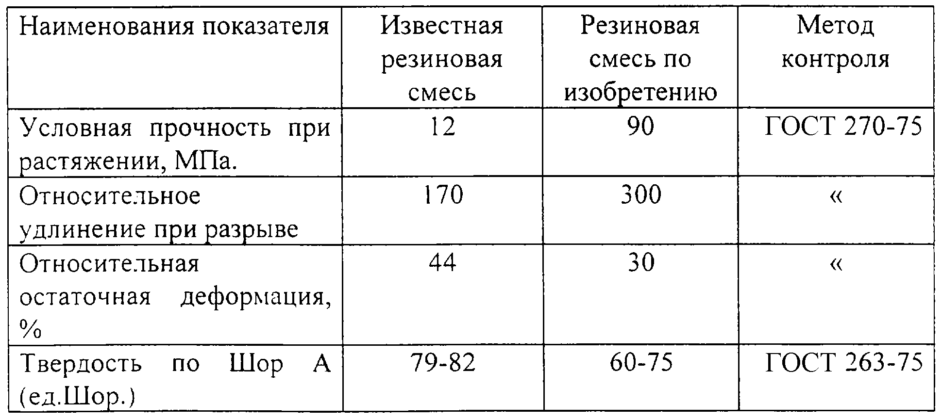 Анализ данных, приведенных в таблице, показывает, что предлагаемая резиновая смесь по изобретению имеет лучшие результаты по показателям: условная прочность при растяжении, относительное удлинение при разрыве и относительная остаточная деформация. Учитывая вышеизложенное, по мнению заявителя, изобретение соответствует условию патентоспособности “промышленная применимость”.