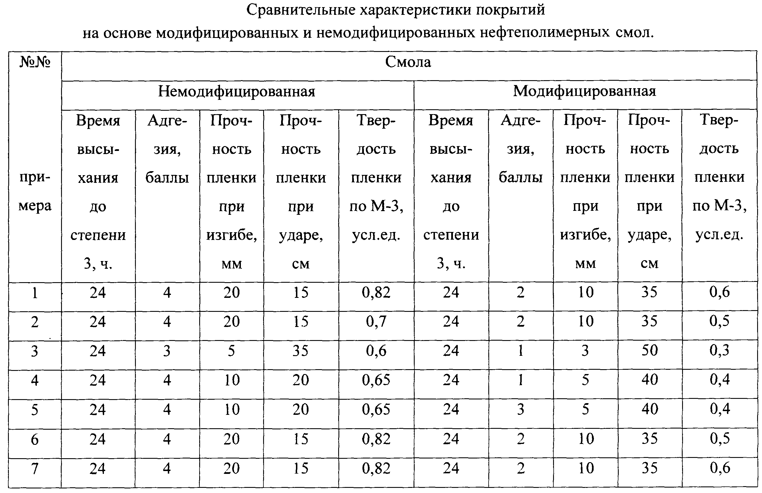 Сравнительные характеристики покрытий на основе модифицированных и немодифицированных нефтеполимерных смол приведены в таблице.