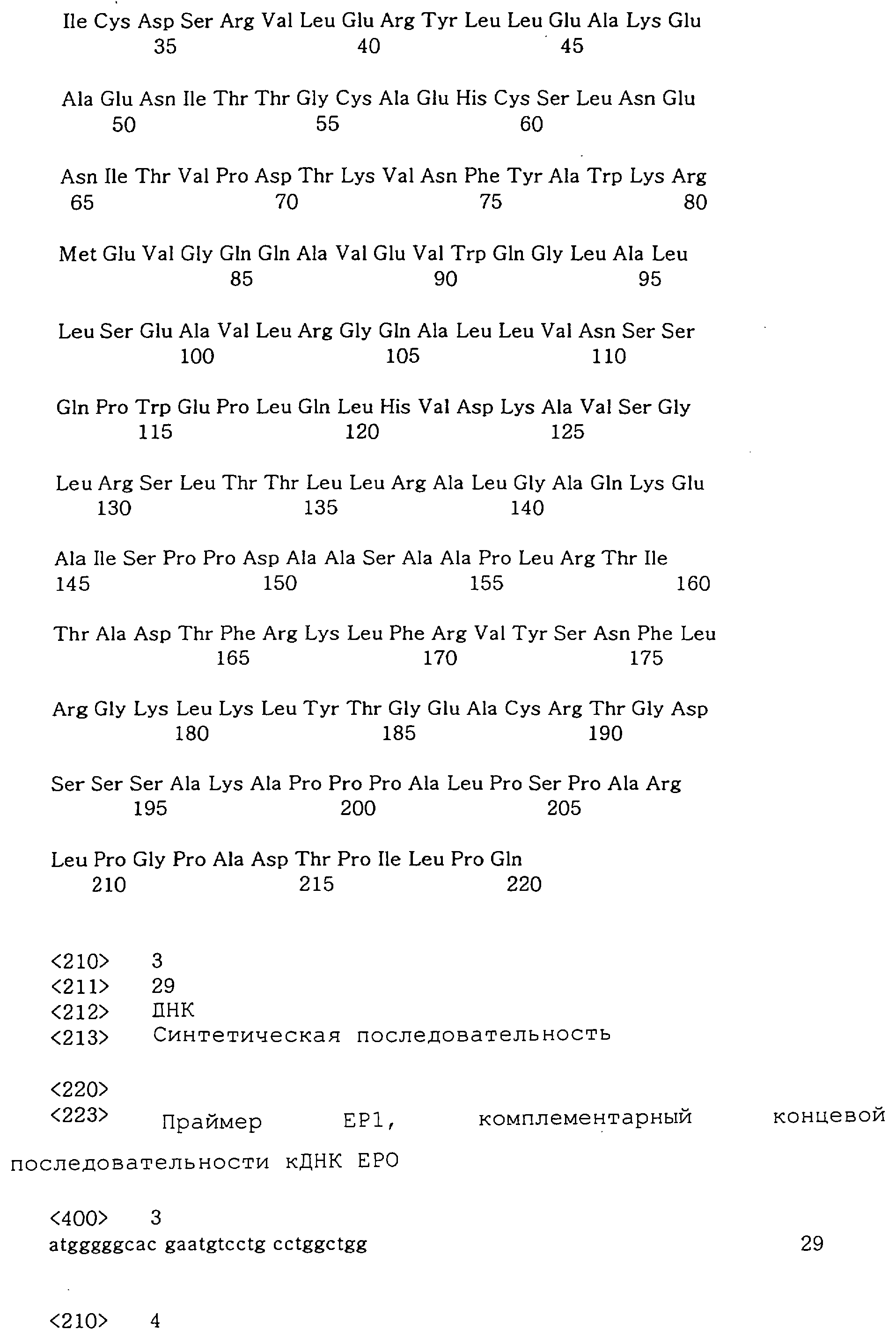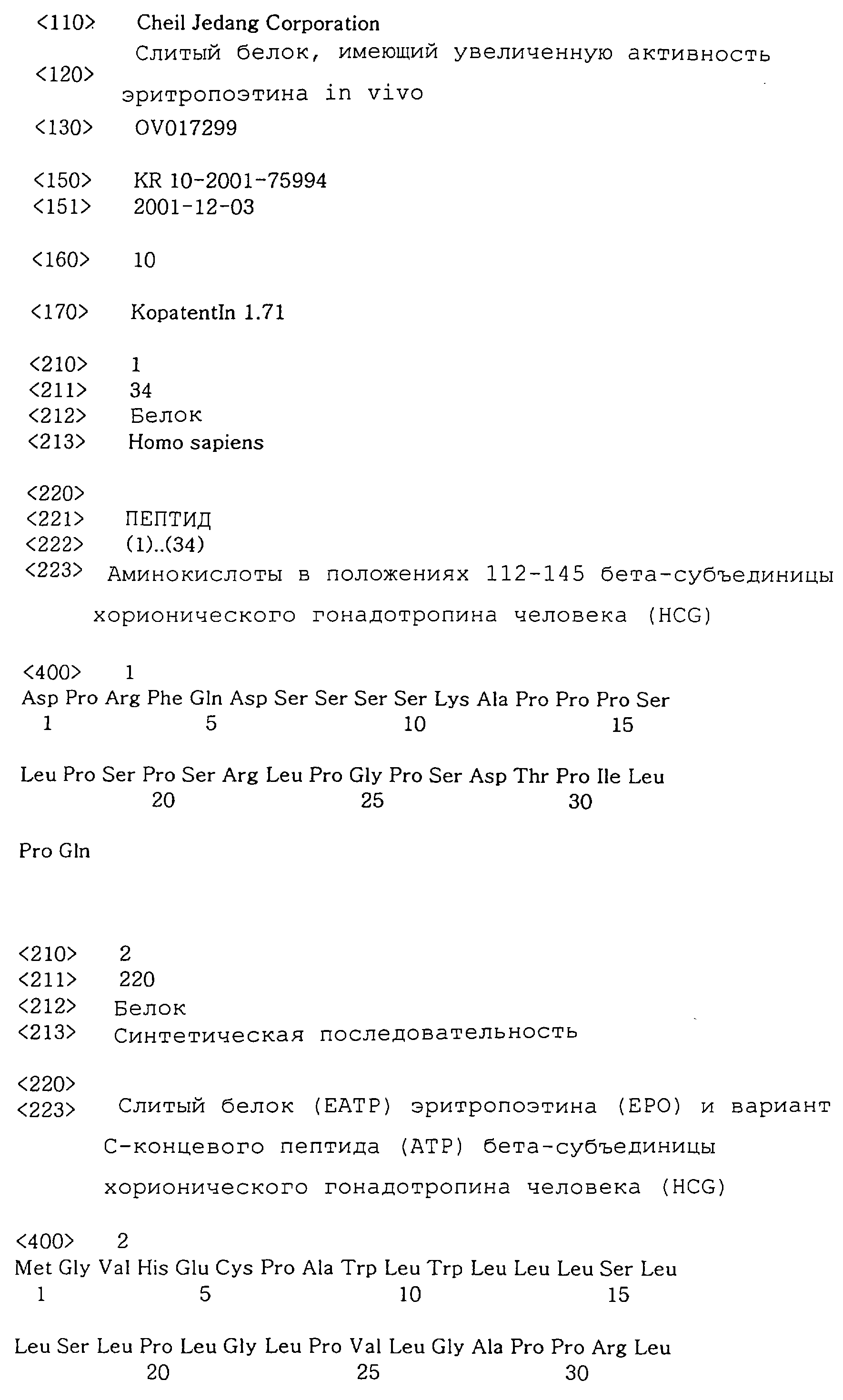 Авторы настоящего изобретения начали интенсивные исследования по развитию нового способа увеличения активности ЕРО in vivo путем слияния новых аминокислот, пептидов или белков с молекулой ЕРО. В ходе проведения этих исследований было обнаружено, что слитый белок, полученный слиянием фрагментов С-концевого пептида (далее называемого также “СТР”) ( -субъединицы хорионического гонадотропина человека (далее называемого также “HCG”), который является природным белком, встречающимся in vivo, с ЕРО существенно увеличивает период полужизни in vivo модифицированного таким образом ЕРО. Кроме того, такой ЕРО содержит аминокислоты, образующие сайты гликозилирования, при сохранении присущей ЕРО активности (см. Заявку на патент Кореи Korean Patent Application No. 10-2000-0075230).