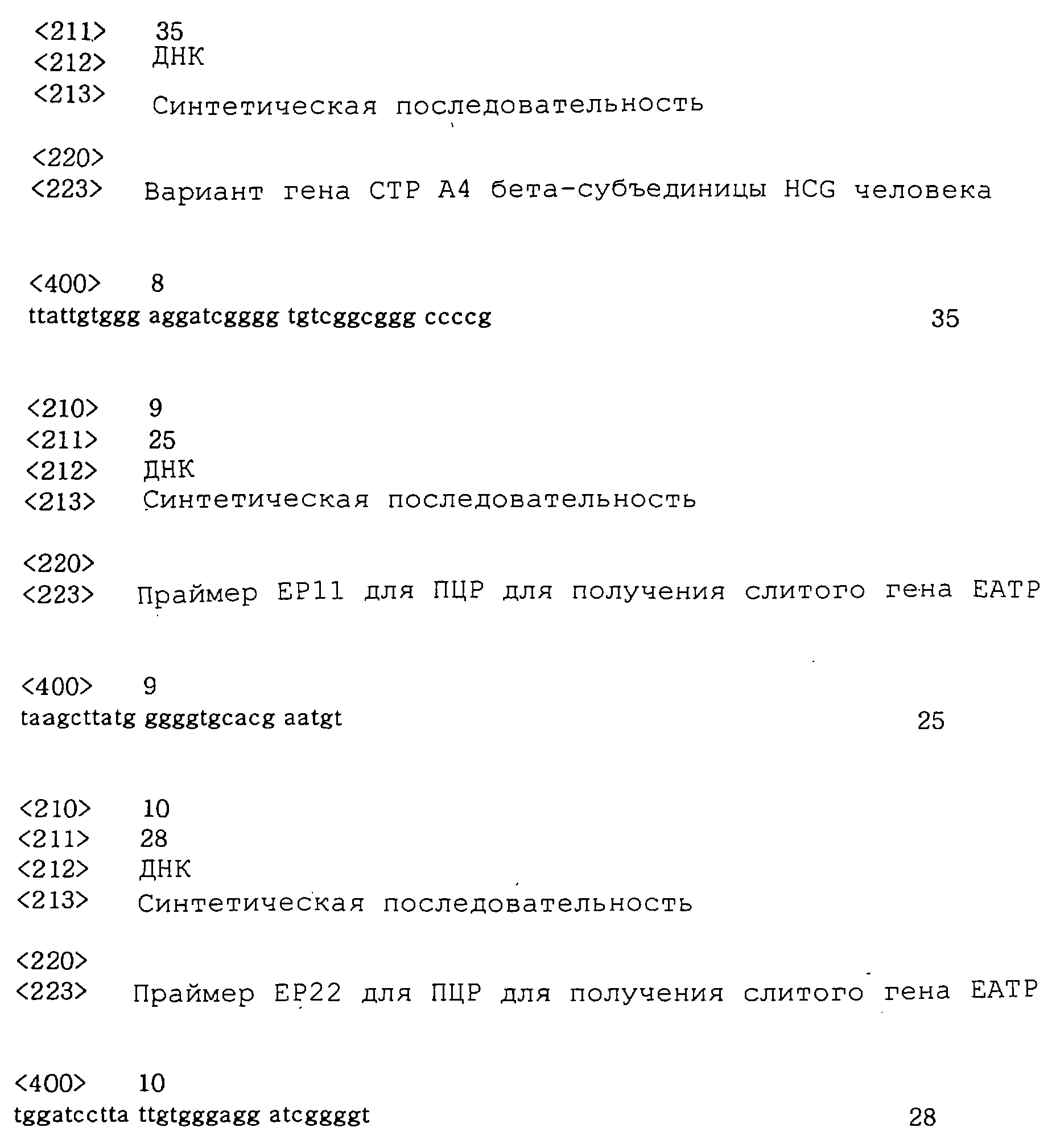 Варианты гена СТР -субъединицы HCG, используемые в данном изобретении, получали с помощью химического синтеза и самопраймирующейся ПЦР. Полученные фрагменты генов были названы ЕА1, А2, A3 и А4: