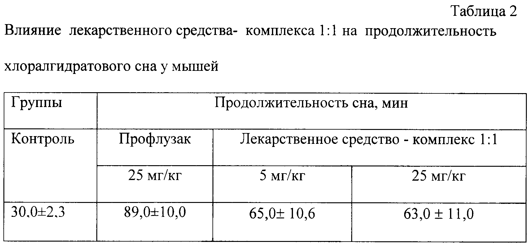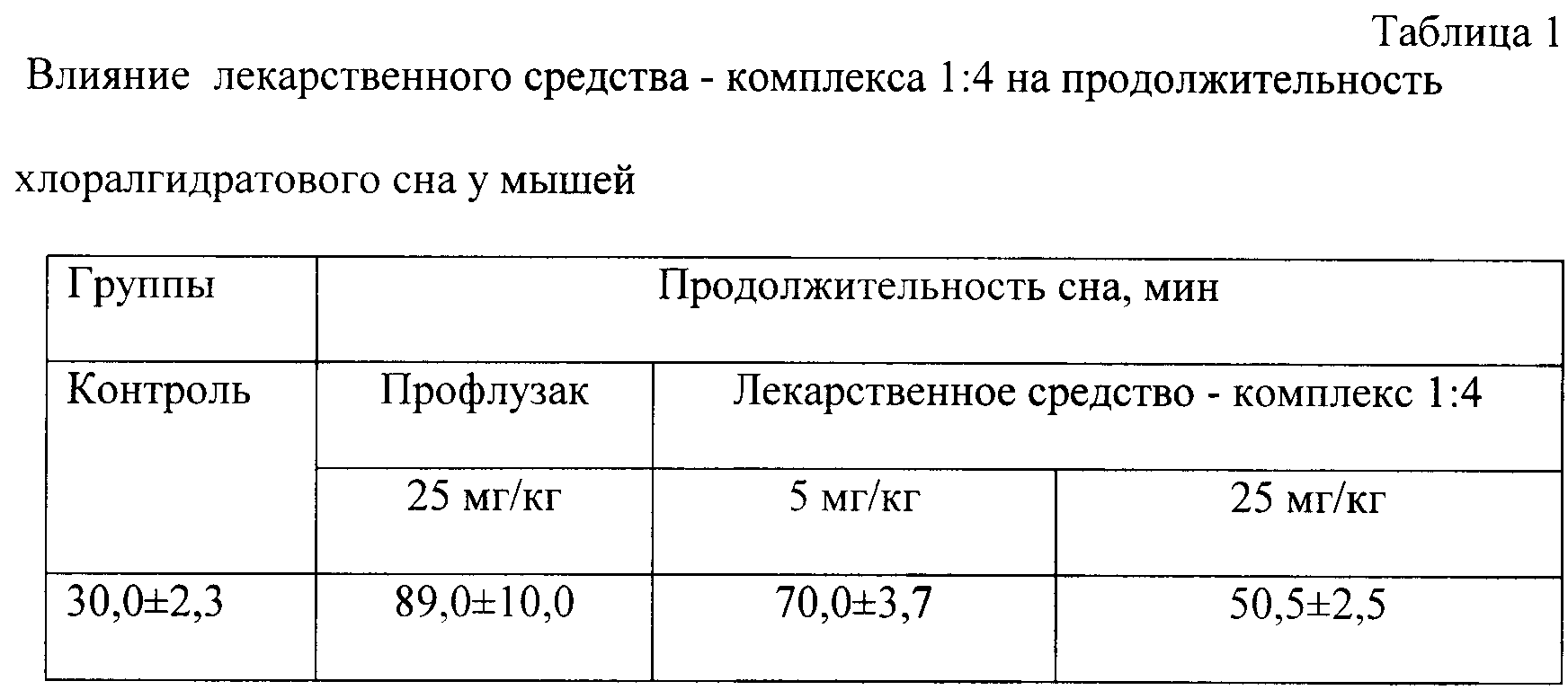 Взаимодействие лекарственного средства – комплекса (в молекулярных соотношениях 1:1 и 1:4) со снотворным препаратом – хлоралгидратом изучали при их однократном внутрижелудочном введении в вышеуказанных дозах. О способности изменения длительности хлоралгидратового сна судили по времени утраты и восстановления рефлекса переворачивания мышей. Результаты, представленные в табл. 1 и 2, свидетельствуют о том, что по сравнению с профлузаком лекарственное средство – комплекс 1:1 и 1:4 почти во всех дозах уменьшали продолжительность сна у мышей.