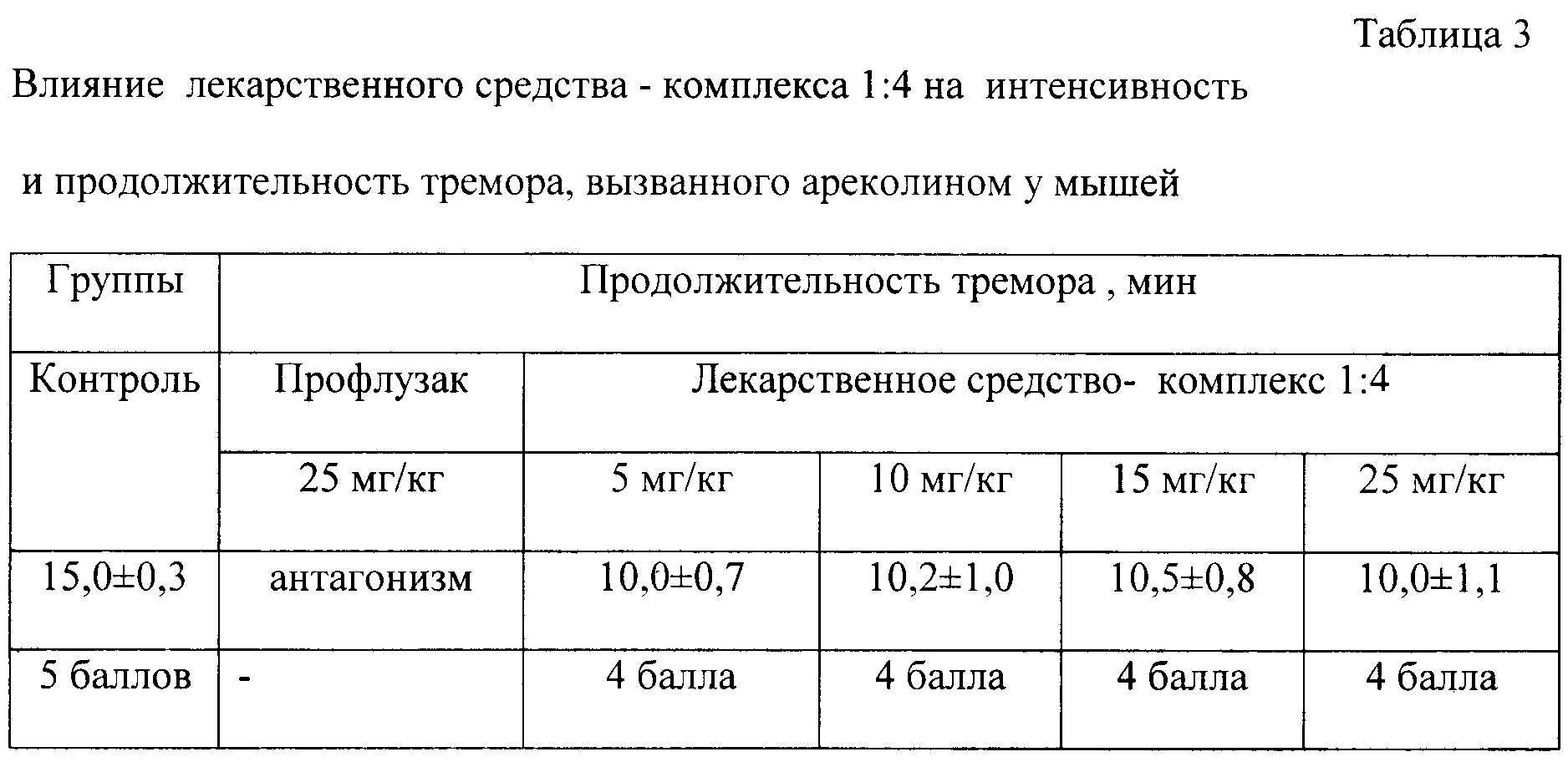 Результаты опытов представлены в табл. 3. В этом тесте лекарственное средство – комплекс 1:4 по сравнению с контрольными животными снижал продолжительность и интенсивность ареколинового тремора. Эталон сравнения – профлузак проявил антагонизм.