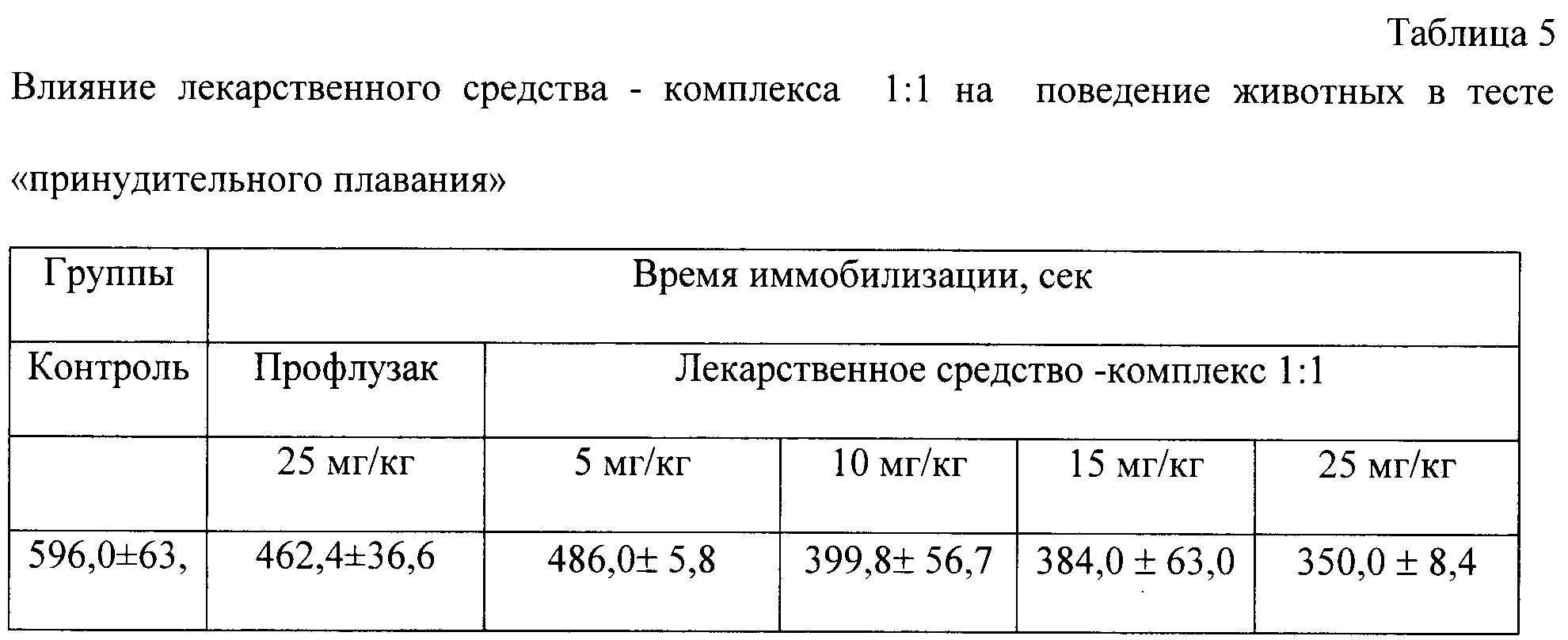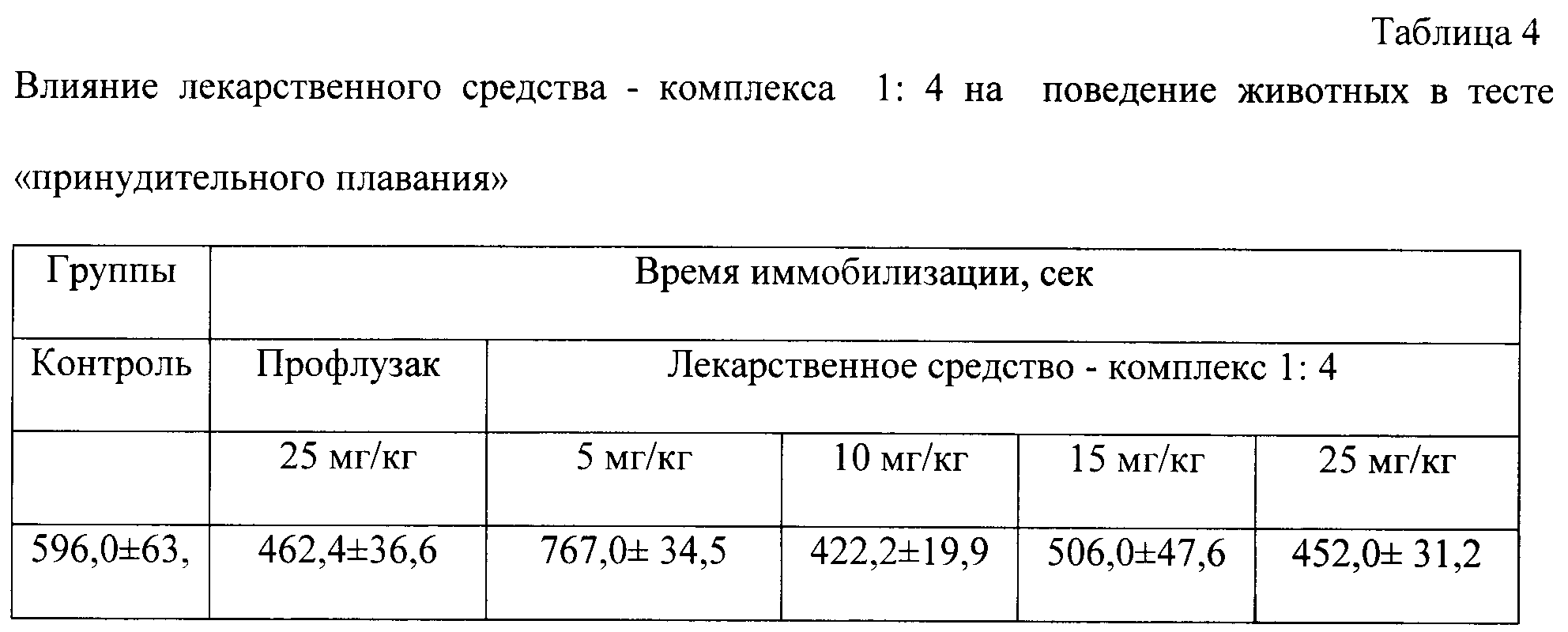 Был установлен дозозависимый эффект. Лекарственное средство – комплекс 1:1 способствовал повышению активности мышей в дозах 10 мг/кг на 30%, в дозе 25 мг/кг – на 25% и 15 мг/кг – на 16%. В дозе 5 мг/кг снижал уровень активности мышей и увеличивал время иммобилизации на 29%. Результаты исследований представлены в табл. 4.