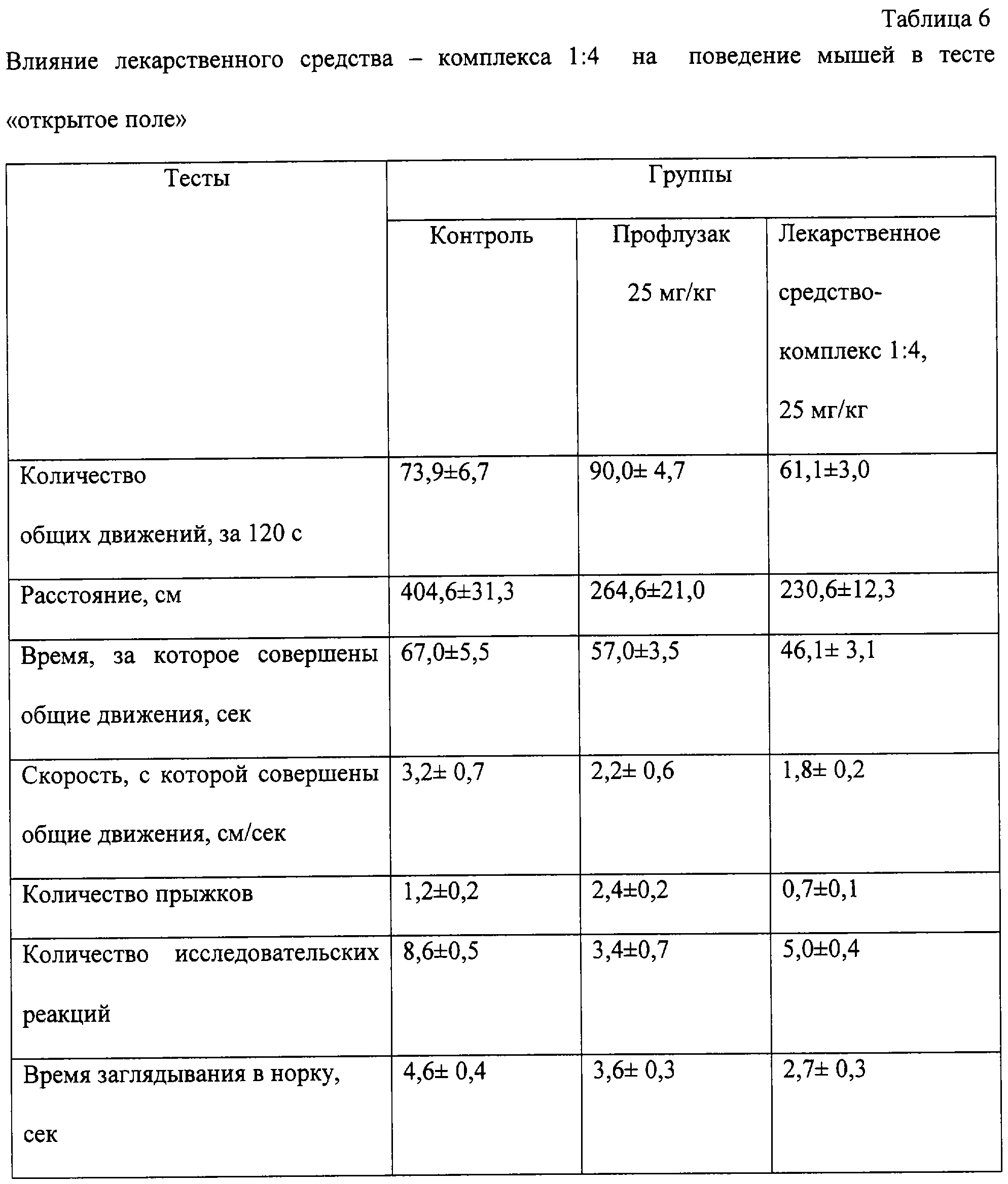 Влияние лекарственного средства – комплекса 1:4 на поведенческие реакции мышей изучали при однократном внутрижелудочном введении агента в дозе 25 мг/кг на модели “открытого поля”. Результаты, представленные в табл. 6, свидетельствуют о том, что лекарственное средство – комплекс 1:4 снижает активность мышей (по количеству общих движений и прыжков) по сравнению с профлузаком.