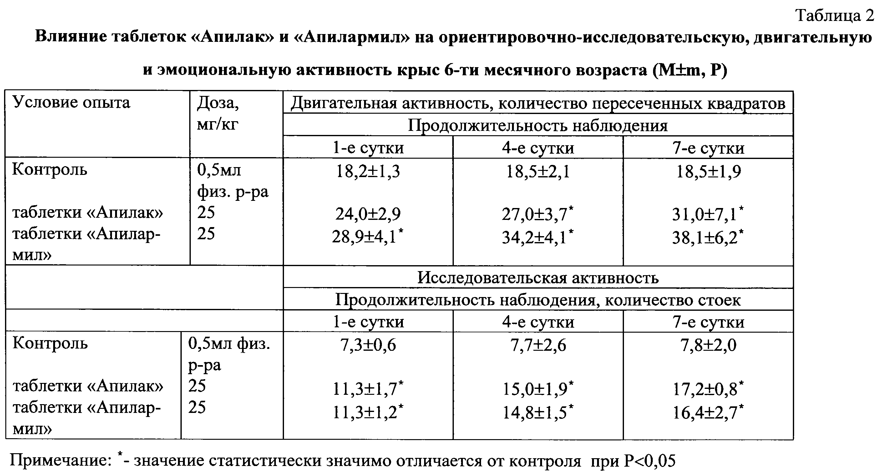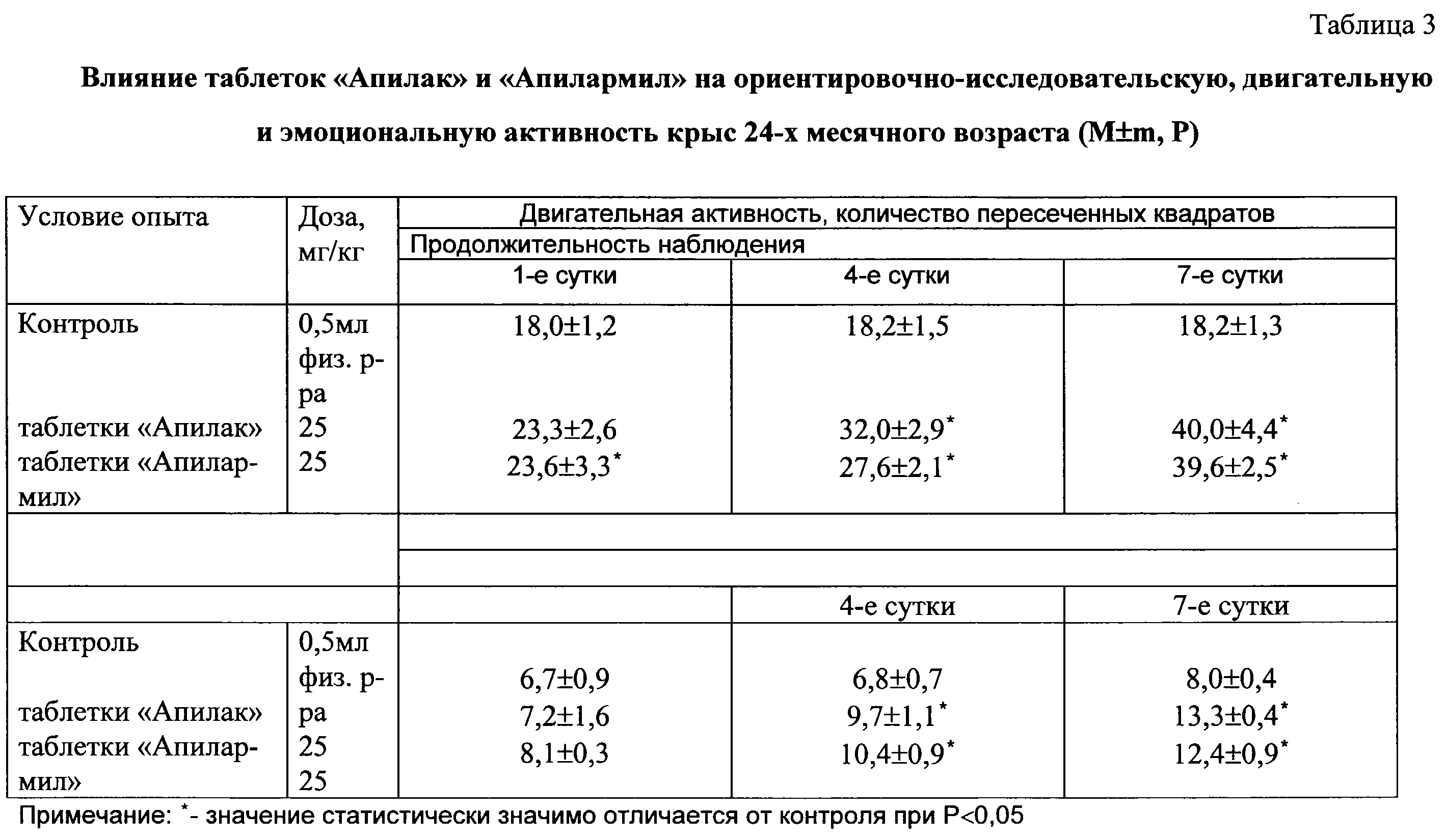 Для оценки актопротекторной активности таблеток “Апилармил” использовали метод “открытого поля”. Изучение данной активности таблеток на основе гомогената маточных личинок проводили на белых беспородных крысах обоего пола 6-месячного возраста (взрослые) массой 200-250 г и 24-месячных (старых) массой 300-350 г. Животные в первой группе получали перорально водные растворы изучаемого препарата. Группам сравнения вводили раствор таблеток апилака, контрольная группа получала 0,5 мл физиологического раствора.
