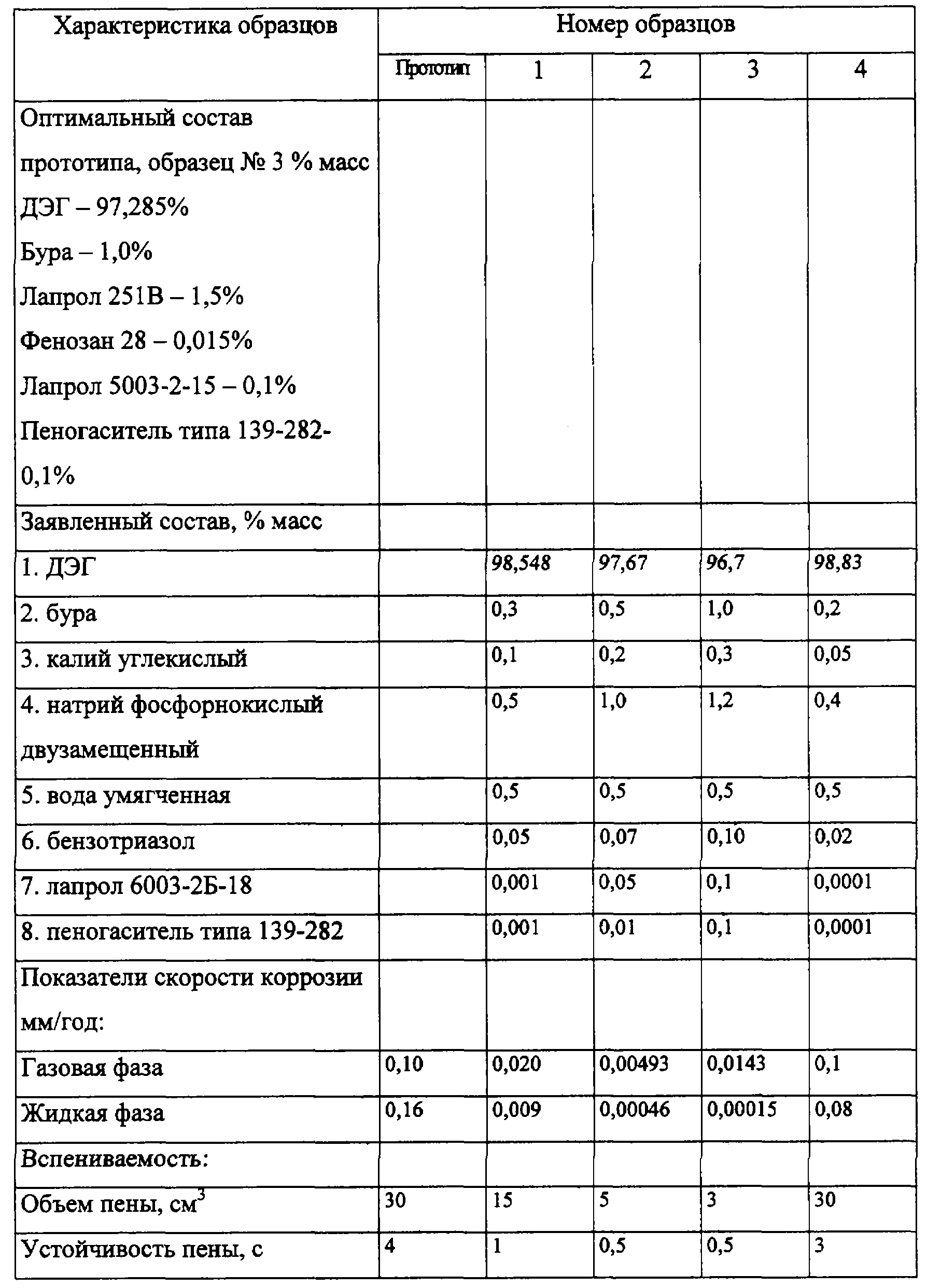 Скорость коррозии в жидкой фазе при использовании известного осушителя составляет 0,16-0,48 мм/год и 0,1-0,25 мм/год в газовой фазе, высота пены 0,3-38 мм при времени жизни пены 0,4-5 с.