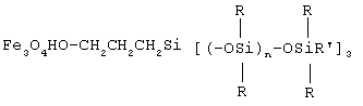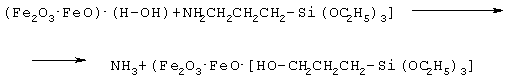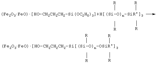 Аппретированная суспензия магнетита затем смешивается с водной эмульсией гидрофобизирующей жидкости. При этом на поверхности магнетита протекает следующая реакция: